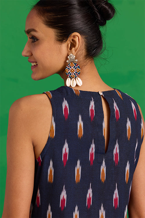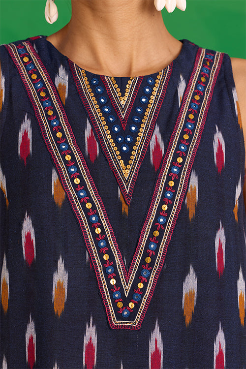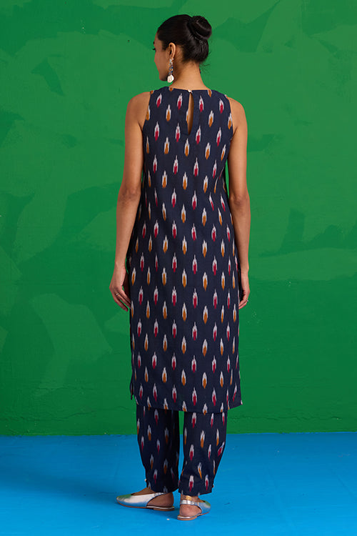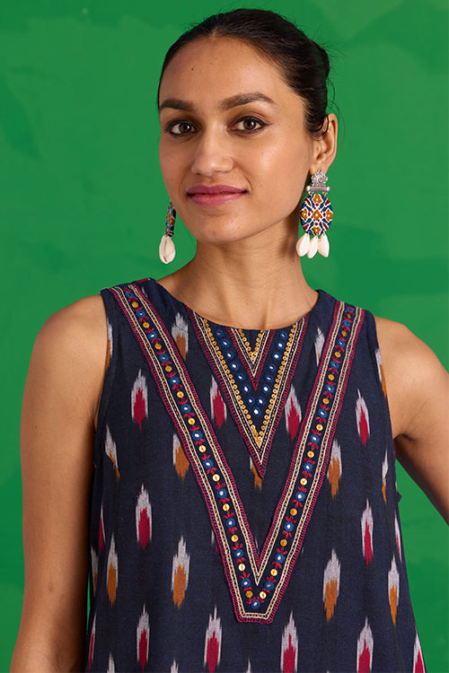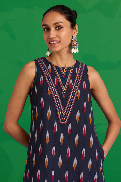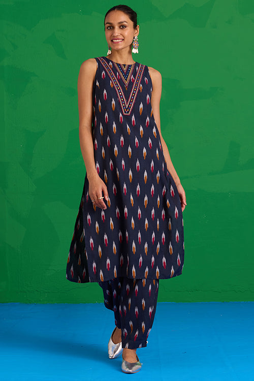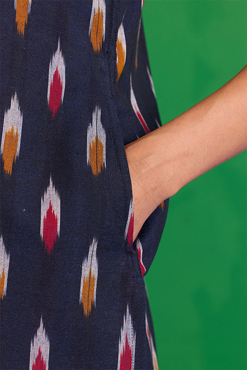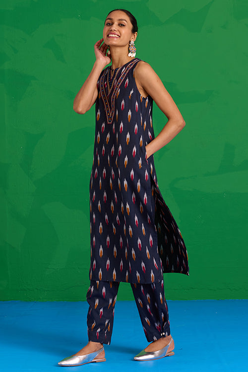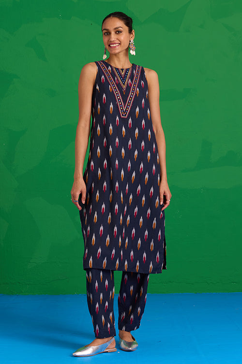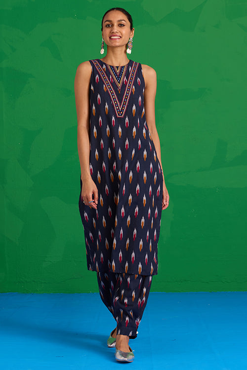 Step into a world of prized craft with the “Great Anamala” Kurta. This piece reimagines traditional Ikkat weaving in a bold, contemporary shape. This navy blue kurta features an embroidered patch yoke, adorned with delicate hand stitches, tikki, and mirrors, adding a sophisticated touch to a classic bomber. Finished with a refined MOP button and loop closure, it also offers two functional pockets for ease. Pair it with the matching "Mahanadi" pants for a uniform look and be ready to look stunning at the workplace or an event!
