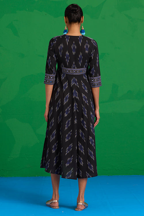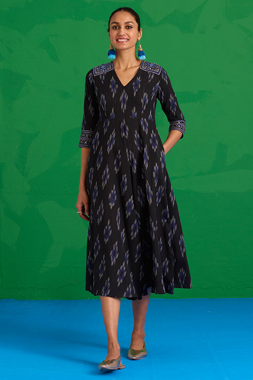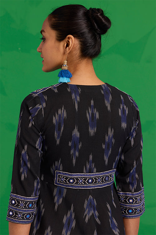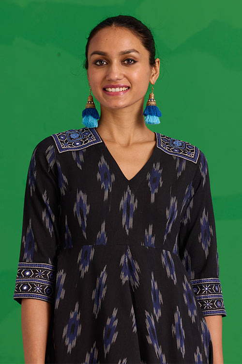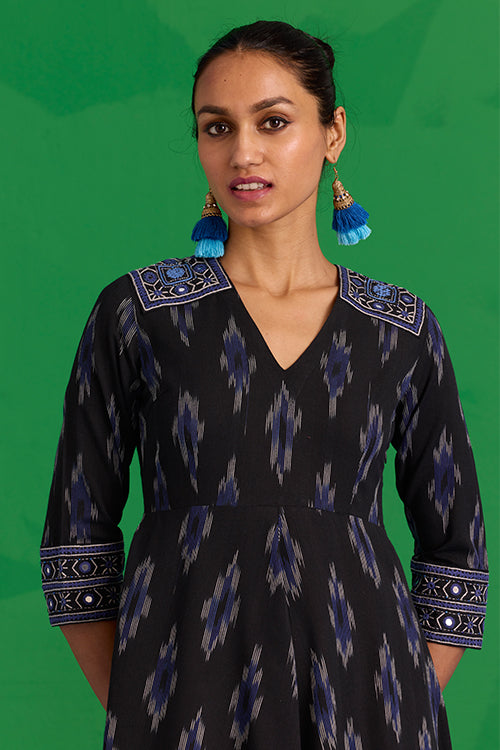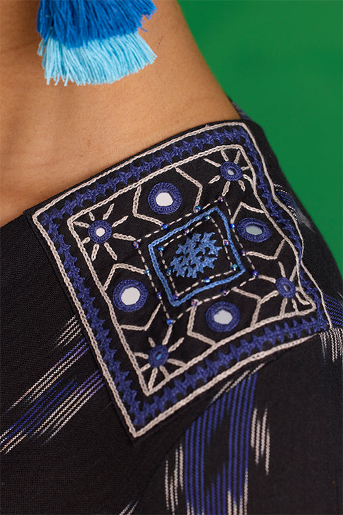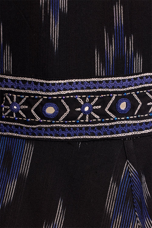 The “Nilgiri” Dress is a statement of artistry in motion. In rich black Ikkat, it’s adorned with hand-embroidered patches on the shoulders, sleeves, and back, each one carefully stitched with Bavadiyo techniques, mirrors, and pops of blue beads. The concealed zipper and two pockets bring subtle, thoughtful touches to the design. It’s the kind of dress that moves with you, blending tradition and modernity in the most effortless way. Pair it with simple sandals or a light shawl, and let the details tell your story.