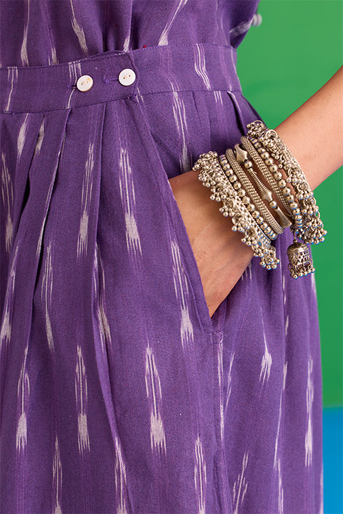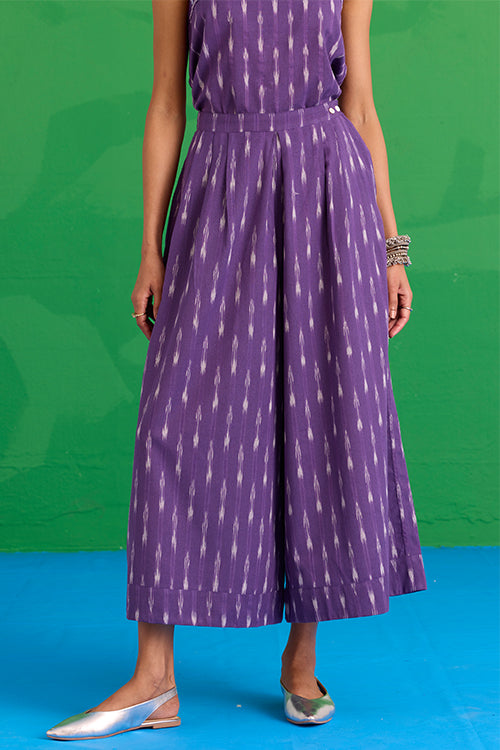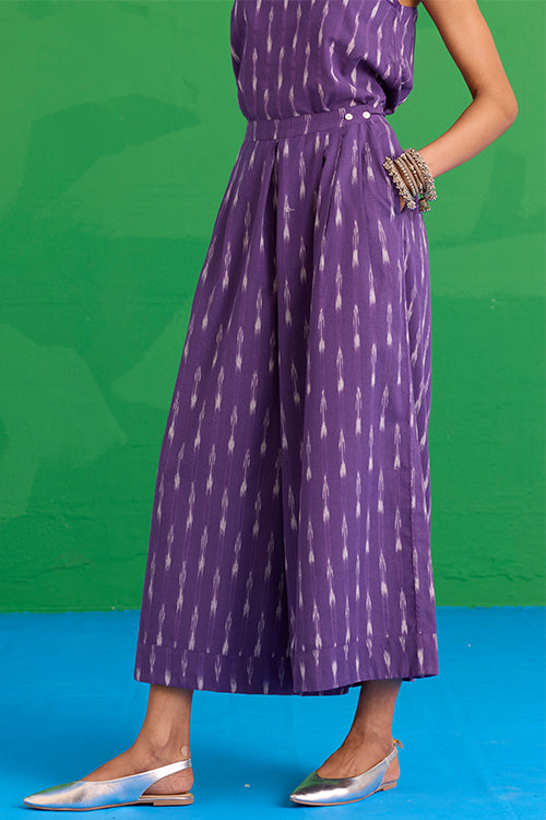 Add a touch of boho elegance with the "Ombra" Ikkat Pants in deep purple pure cotton. Featuring an overlap waistband with MOP buttons and two front cross pockets, these pants offer a perfect blend of functionality and flair. Pair them with the matching "Mulberry" top for a coordinated, effortlessly chic look, and elevate the ensemble with artisanal jewelry. Ideal for a relaxed yet refined day-to-night style, these pants bring artistic charm to any occasion.