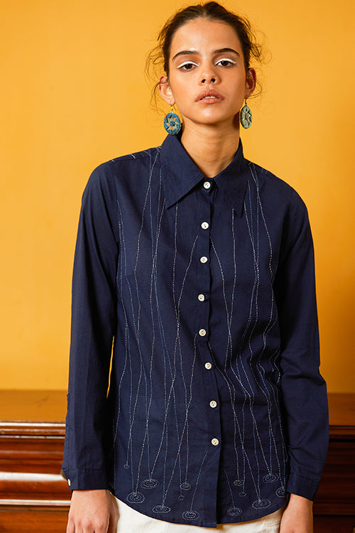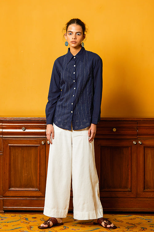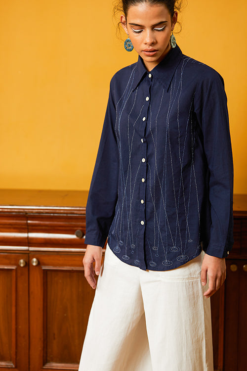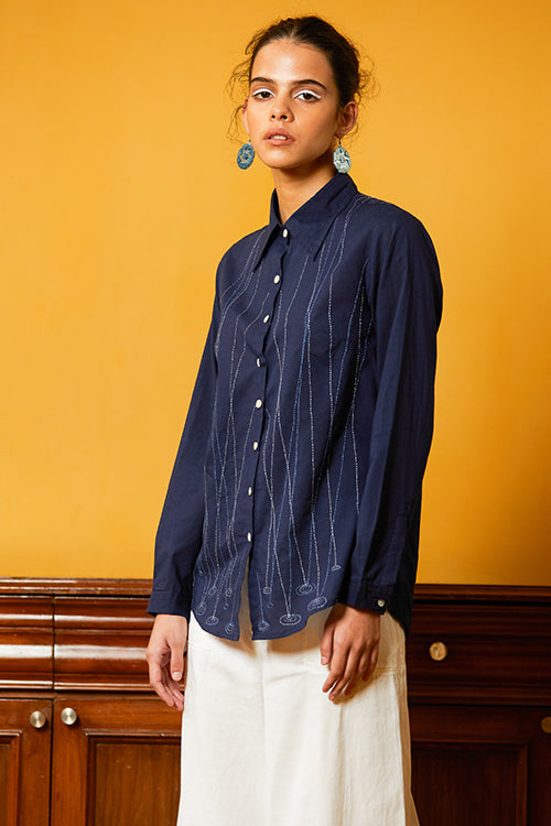 When the monsoon season meets the festive season, a special collection is born! Okhai’s ‘Puddle’ is a rich indigo shirt carefully crafted in pure cotton fabric. The most comfortable and chic piece of clothing you can own! It’s a full-sleeved shirt with running stitch embroidery depicting the flowing rivulets and hitting the earth to form little puddles! Charming, no? We think so! You get a classic collar and a functional placket. Forget the traditional suit-salwar option this Diwali. Go contemporary and stay in vogue!