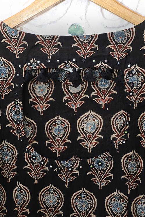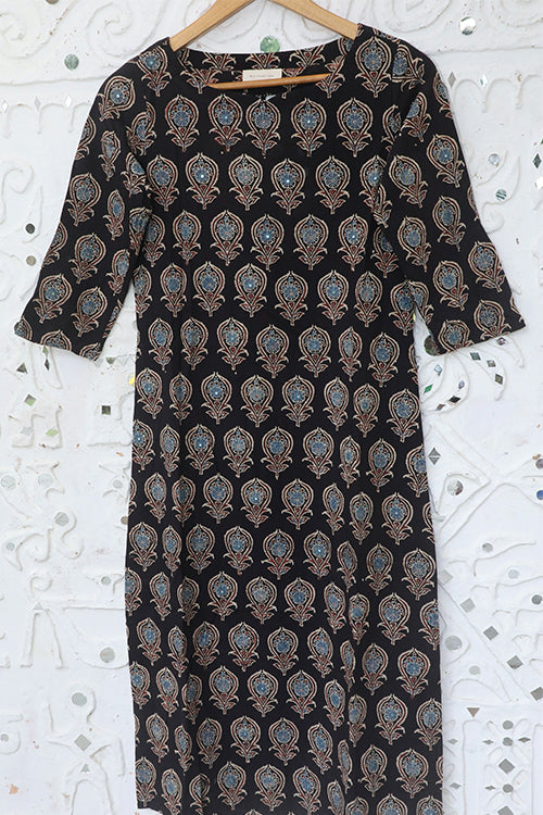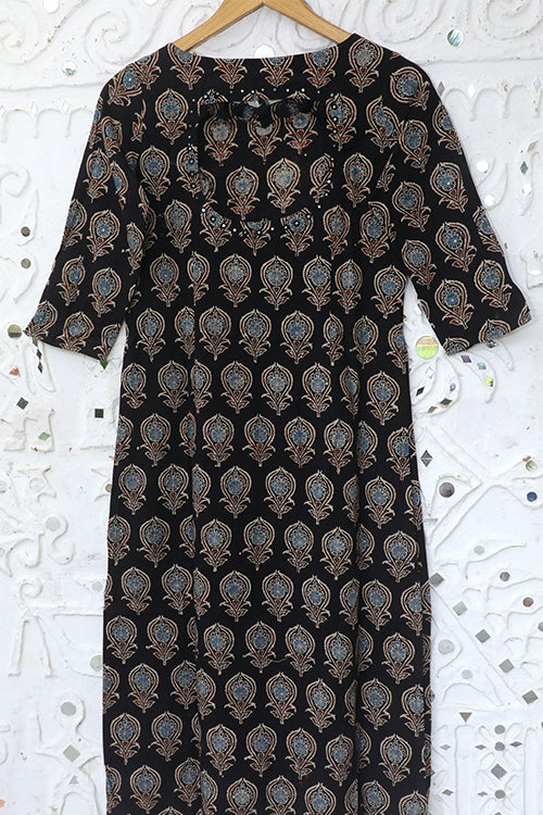 This garment is a final sample and for size and fit please refer size chart. Go through the wash care below carefully. Returns and exchanges are not possible on sample sale. Fabric Type: Hand Block Printed Cotton Wash Care: We use natural dyes in some of our products, since dark colours tend to run dry cleaning is recommended. The first few times wash in cold tap water, wash inside out and dry in shade. Use mild detergents only.