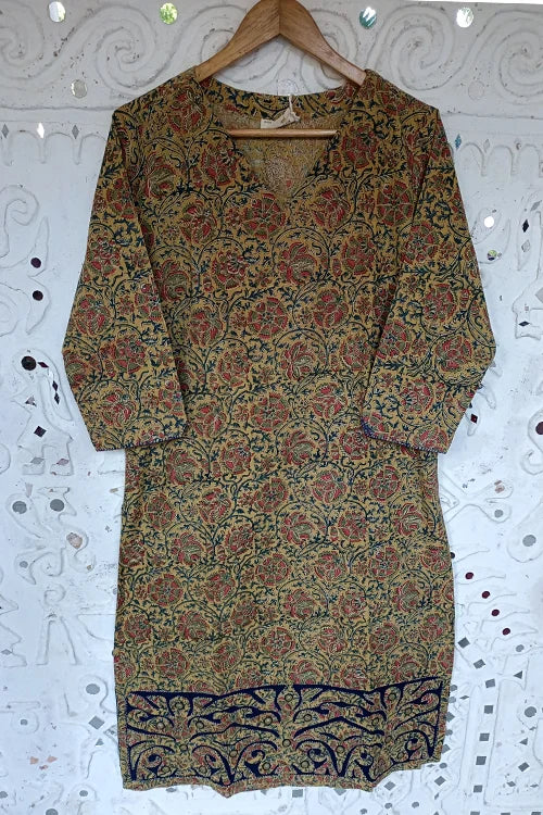 This garment is a final sample and for size and fit please refer size chart. Go through the wash care below carefully. Returns and exchanges are not possible on sample sale. Fabric Type: Hand Block Printed Cotton Wash Care: We use natural dyes in some of our products, since dark colours tend to run dry cleaning is recommended. The first few times wash in cold tap water, wash inside out and dry in shade. Use mild detergents only.