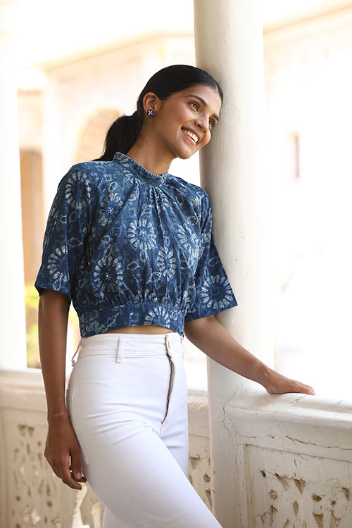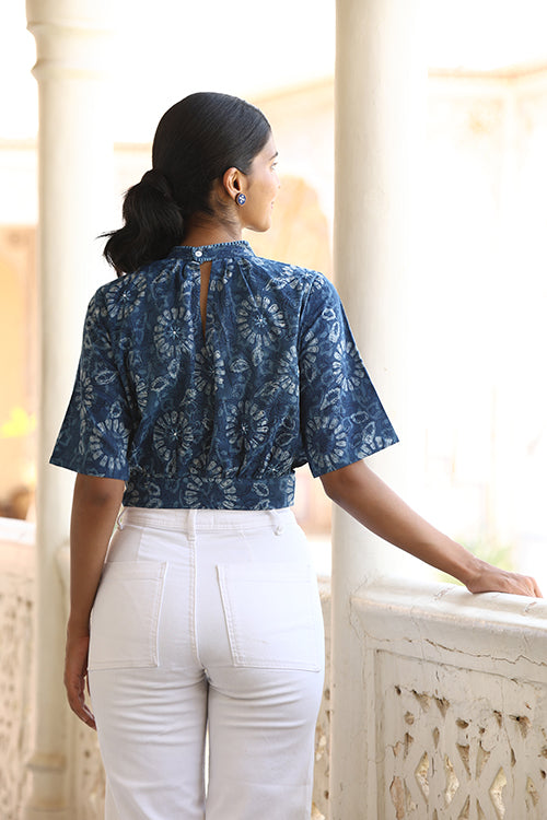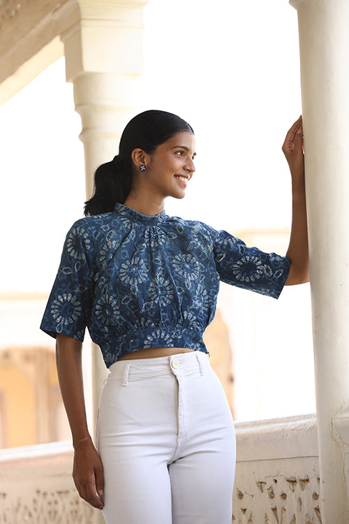Embrace the elegance of the "Sky Blossom" Hand-Embroidered Beadwork Pure Cotton Indigo Top. Handcrafted from pure cotton in a brilliant indigo color, this top features glorious floral motifs handblocked throughout by our skilled artisans. The laisy daisy stitch and beadwork adorn the neckline, front, and back, adding a touch of intricate beauty. The side zipper and buttonhole ensure a seamless fit, while a single Mother of Pearl button at the back offers a charming closure. Pair the "Sky Blossom" top with jeans or neutral pants for a chic workwear look or throw it on for a breezy summer adventure.