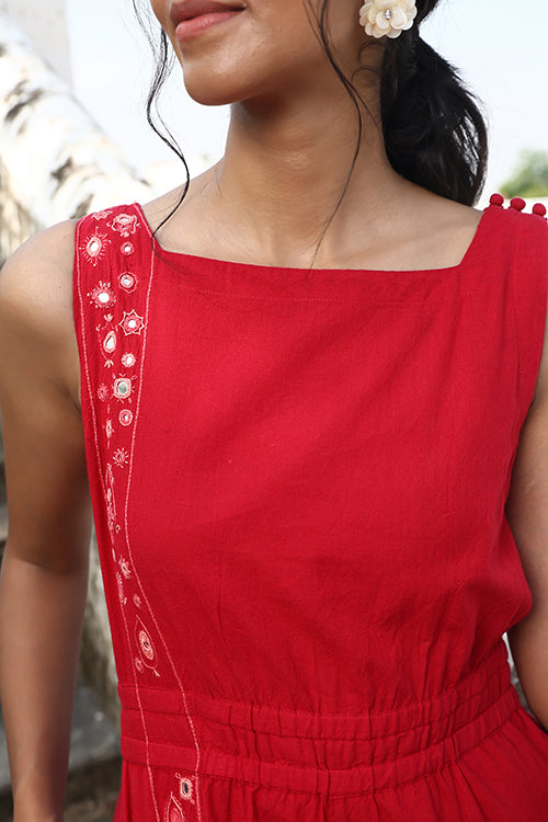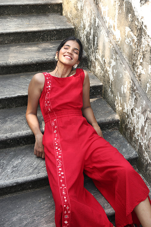 Elevate your style with the "Supernova" Hand-Embroidered Mirrorwork Jumpsuit. This vibrant red jumpsuit, crafted from pure cotton, features a concealed side zipper and fabric potli buttons with loops for a seamless closure. The intricate embroidery, showcasing chain, running, laisy daisy, stem, buttonhole, French knots, rice, and satin stitches, spans from shoulder to hem on the right side, adding a touch of elegance. With two convenient side pockets and a striking hue, the "Supernova" jumpsuit is perfect for a chic brunch or an evening soiree.