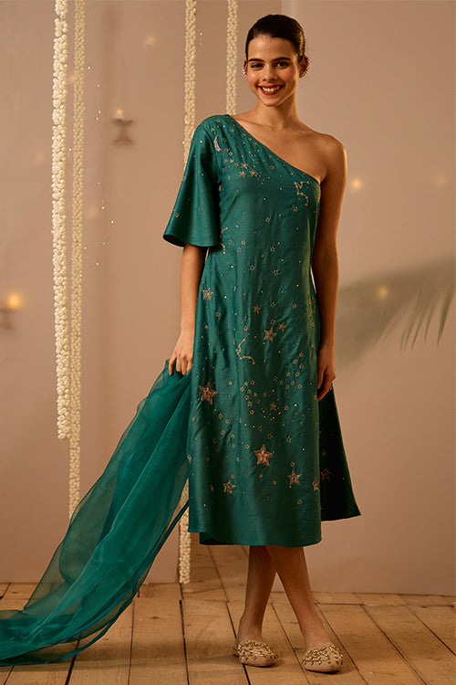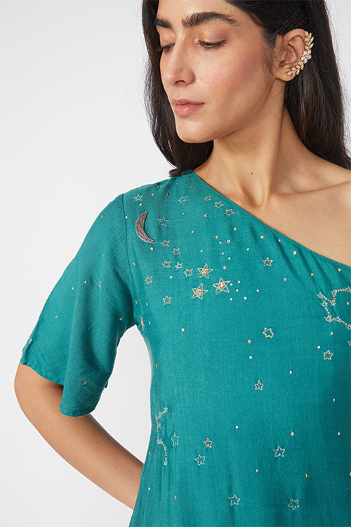 Delicately crafted on a light sea green silk blend piece of fabric, this dress is embellished with Kasab, Dabka, Sequins motifs of the moon, stars, comets and planets all over, including the front, back and the sleeve. With only one shoulder, the dress provides a soft lining of mulmul in the sleeve, as well as a body part, kept open from the bottom hemline to avoid any discomfort. To accentuate the fit from the waist, the dress comes with a concealed zipper on the waist side seam along with two pockets for your comfort.