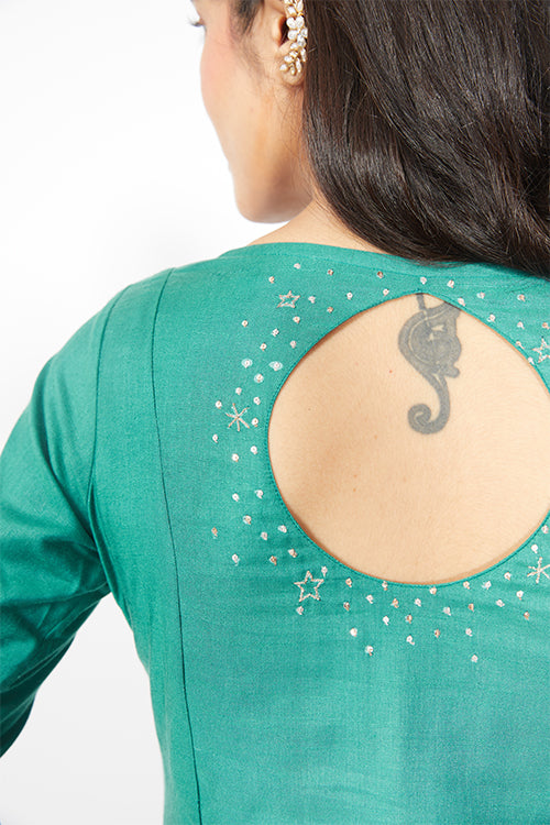 "Relish the refreshing shimmering of the shades of blueish green in the form of our 'Utopia', a three-piece elegant ensemble for you to be in the spotlight of the event as you make a fashion statement. The decorative kurta is adorned with Kasab and Sequins work, showcasing stars and planets in front and on both of the sleeves and near the keyhole at the back to make the garment a perfect choice for you to show off this Diwali party. The kurta is paired with silk blended pants and an organza dupatta to add a pop of colour to your complete look. The pants provide you with a loop inside zipper with press buttons for you to tight or loose the fit according to your liking. Darts in front and elastic at the back is also provided to make the fit more comfortable for you. Don't forget to pair the lovely ensemble with a pair of juttis to make the ethnic look more traditional and festive!"