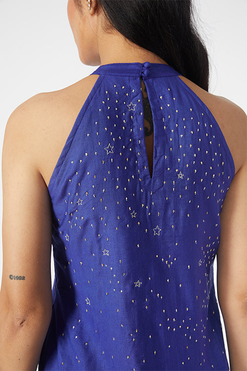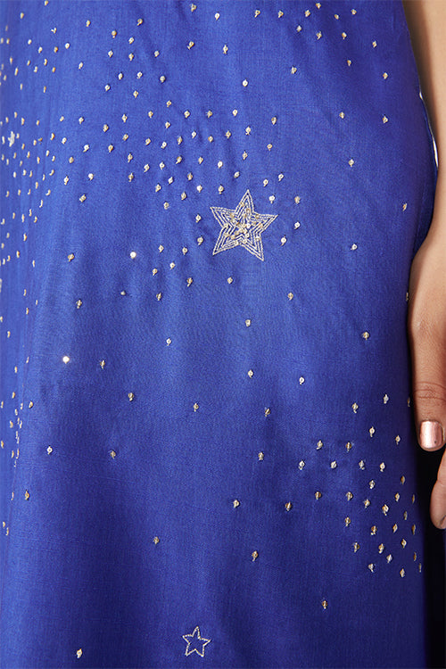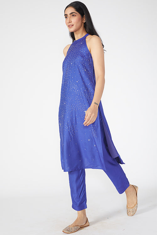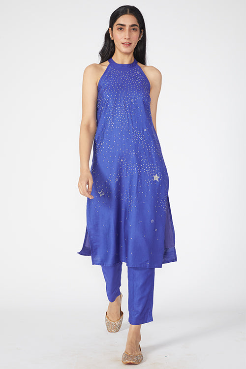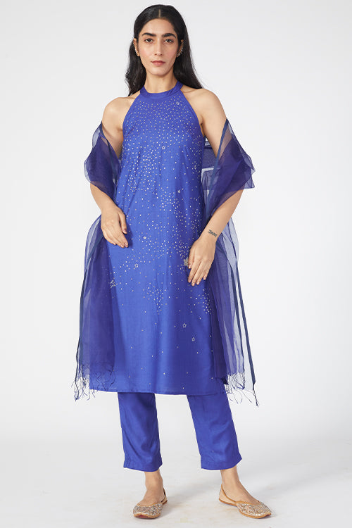 "Let your clothes do the talking this festive season like this one that we like to call 'Venus' screams all that shimmer and glimmer whenever you want to say you are ready to celebrate the festivities! This is the modern ensemble for the diwali parties and the cocktail functions where you can don the all blueberry monochromatic look. The haltered neck kurta is delicately adorned with motifs of stars having work of Kasab, sequins in front and at the back. An adorable feature, apart from its glistening work is that it also comes with potli buttons at the back for closure. The silk-blend pants, that come along with the set, have a zipper with press buttons and an elastic at the back to provide you with the utmost comfort according to your liking. You also get a lightweight and flowy organza dupatta in the same to create a monochromatic look and make a fashion statement at the upcoming Diwali party or a wedding function. You must add a pair of statement earrings to complete the look. Being a three-piece set, it allows you to style it in several ways by mixing and matching it with either contrast coloured dupatta or a solid colour kurta. "