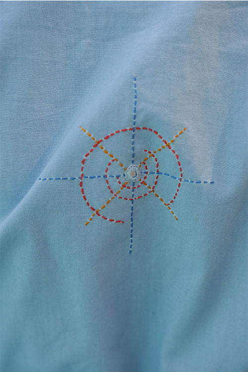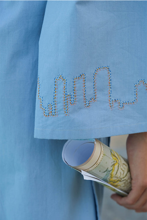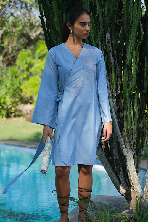 The 'Wayfarer' Wrap Dress is a sky-blue beauty that will make any travel-loving woman swoon. Crafted with intricate embroidery work featuring stem and running stitch on the front panel, back, and both sleeves, the dress also includes playful mirrors in between the embroidery. The design is inspired by Mumbai and its stunning skyline, making it perfect for women who love exploring new cultures and places. The single pocket adds convenience for when you're on the go. The dress is designed with your comfort and convenience in mind. The wrap style allows for easy adjustment to your body shape, while the lightweight fabric ensures you stay comfortable throughout your journey. Dress it up with a pair of heels and statement jewellery for a night out or pair it with comfortable sandals or sneakers for a more casual look. 'Wayfarer' is the most adorable travel companion that adds a touch of elegance to any outfit. Whether you're exploring new places or simply enjoying a sunny day out, this dress is a must-have for any adventurous woman's wardrobe.