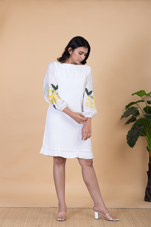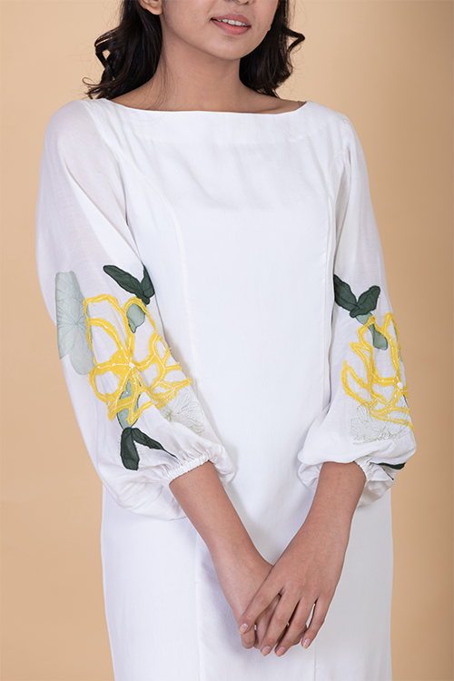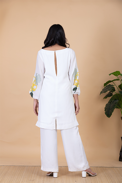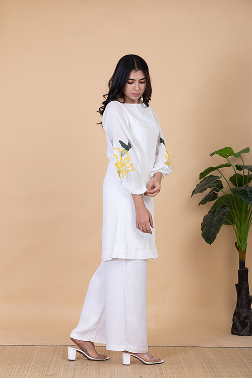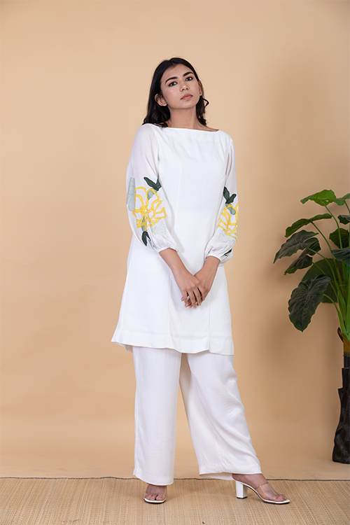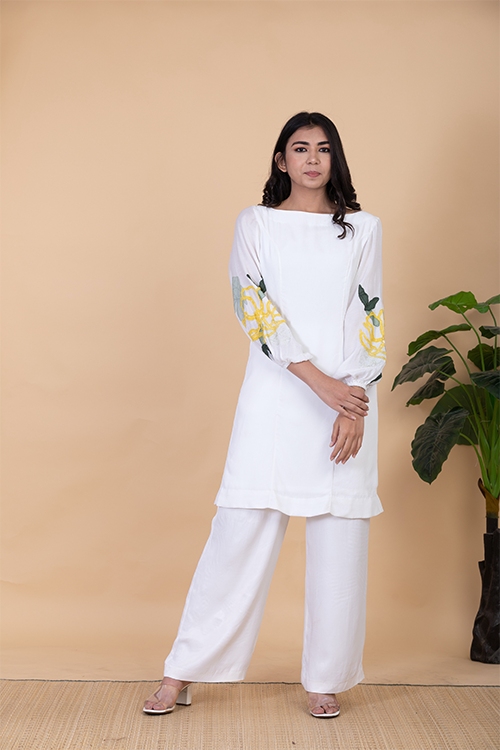 THIS ITEM IS NON - RETURNABLE. Born from the idea that celebrating oneself is the significant need of the hour, these tranquil trans-seasonal pieces are carefully hand crafted to bring comfort and excitement to mindful wardrobes. The collection is a mix of over layers, comfort fits and statements in Hand-spun & Handwoven desi cotton from the traditional looms of Gujarat, plant based silks and organza’s woven in parts of Bengal. This timeless but cheerful collection made from skin friendly fabrics will make you stand out and reflect your glow. Wear these pieces as a set or wear them as separates expressing your uniqueness with our threads. Play with it as separates and team each piece up with something you already own. Please feel free to get only the tunic or the complete look to suit your preferences. Dress * Boat neck princess line panelled * Contrast peasant sleeves with elasticated cuffs * Signature delicate flower applique embroidery * Straight fit * Tunic Length - 38" * Colour: White * Model is 5.8" wearing size M * Made with All weather Silk on sleeves and crepe * Consciously Made PANTS * Elasticated back with a concealed drawstring in the front * Straight wide leg Pants * Full length * Length: 39" * Colour: White * Made with Pure All weather Silk * Ethically made