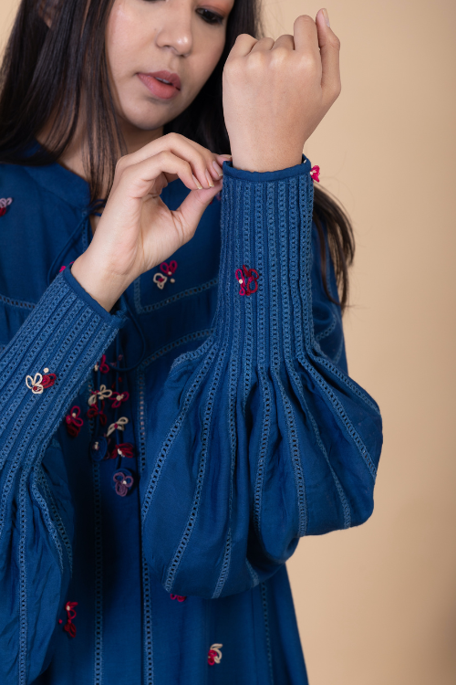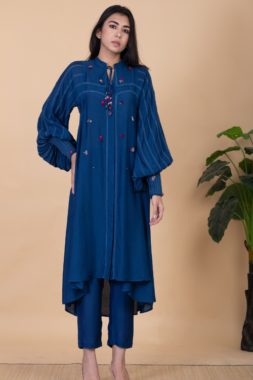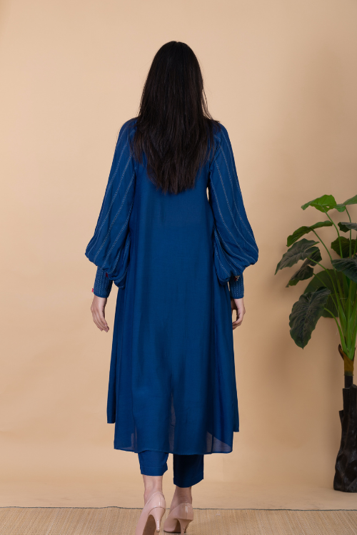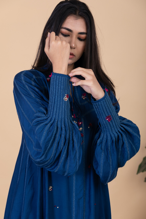 THIS ITEM IS NON - RETURNABLE. Introducing Jashn which is a timeless yet cheerful collection handcrafted from skin friendly fabrics and is designed to stand out and yet keep you comfortable. Wear this as a poetic expression of intimate festivities that you can dress up or down as you please! Play with it as separates and team each piece up with something you already own. Dress * High low Dress * Band collar with tie up * Statement Sleeves with Hand-crochet inserts and cuff * Signature thread embroidery * Front placket with concealed buttons * Relaxed Fit * Front Length: 42.5" Back Length: 48" * Sleeve Length: 30" * Colour: Cobalt Blue * Model is 5.8" wearing size M * Made with Pure Pure All weather Silk * Consciously made PANTS * Elasticated back with a concealed drawstring in the front. * Straight Pants * Ankle Length * Length: 37" * Colour: Cobalt Blue * Made with Pure All weather Silk * Ethically made