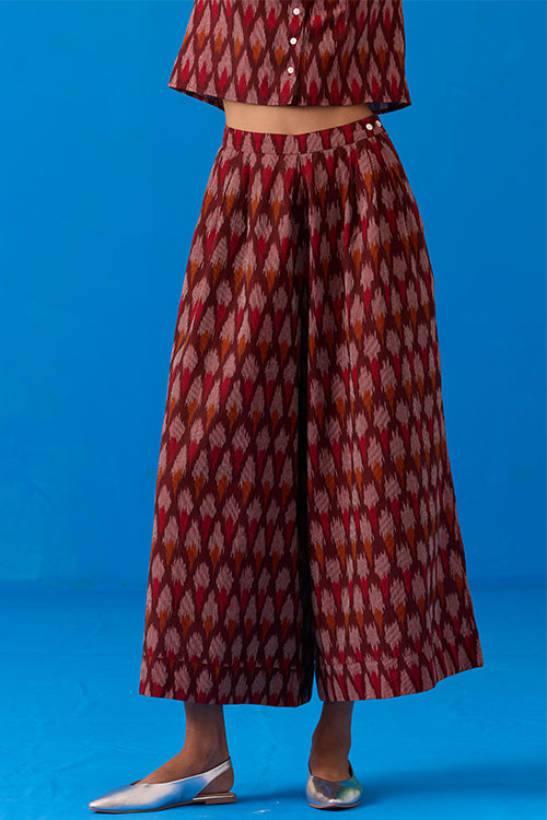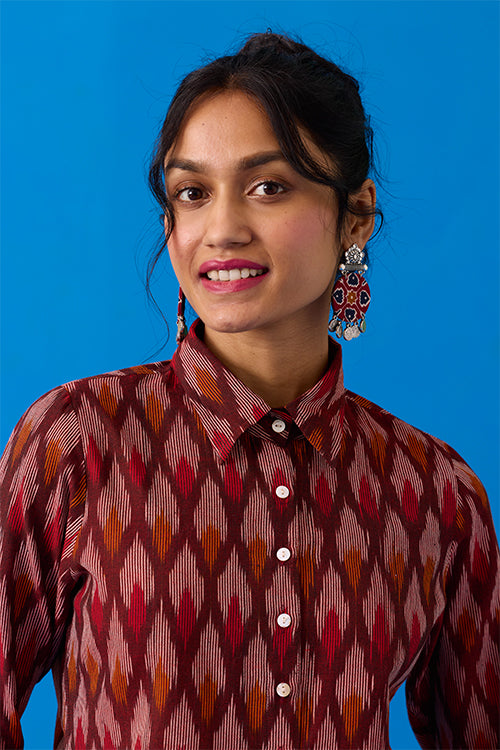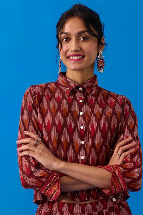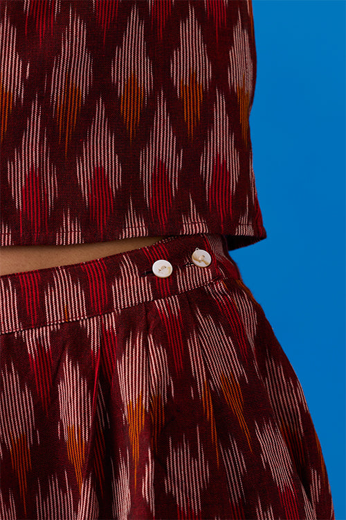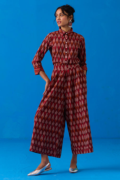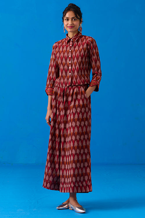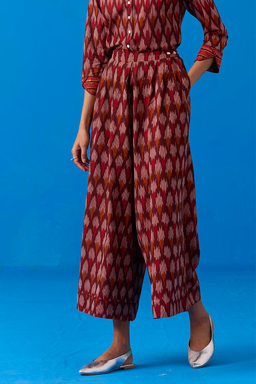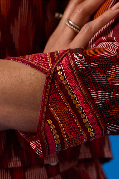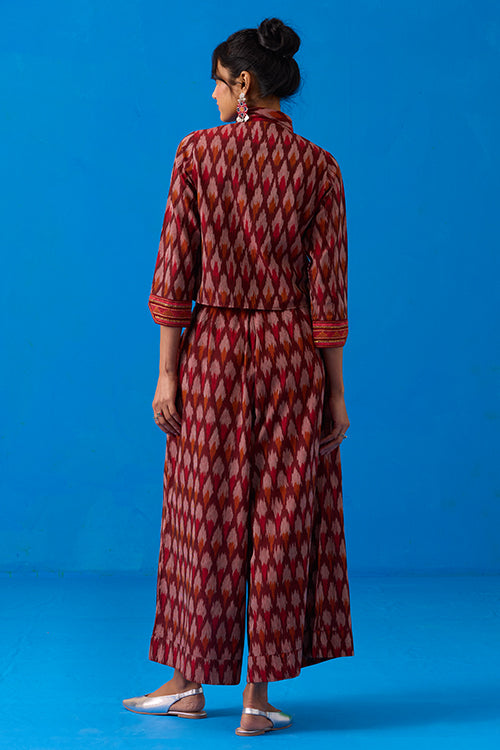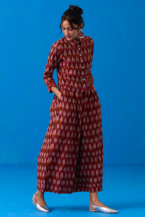 Rooted in tradition yet crafted for today, the "Colossal" Ikkat Top and Pants Set offers understated elegance in every detail. Woven from earthy brown pure cotton ikkat, the top features intricate embroidered patches on the sleeve cuffs, showcasing chain, jali work, satin, and running stitches accented by gleaming metal tikkis. A functional placket with MOP buttons adds a refined touch. The tailored pants, complete with a comfortable waistband and two cross pockets, ensure ease without compromising on style. A versatile choice for workwear or casual gatherings, this set is your perfect companion for sheer sophistication.