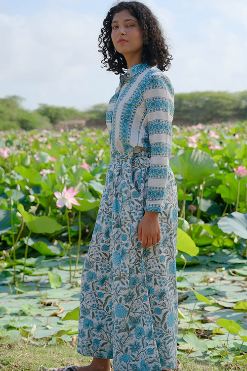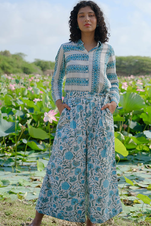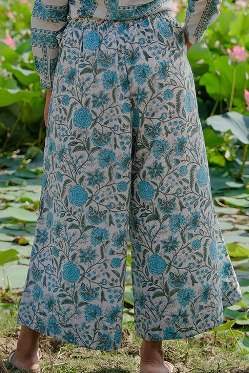 Crafted from pure cotton, tranquil blue hues of floral bloom captured through the art of hand-block printing all over the ivory white pant. With your comfort being our utmost priority, the pants come attached with lining to avoid transparency. An overlap waistband has been provided along with 2 Mother of Pearl buttons and a belt to keep it all in place. Keep your phone or essentials at hand as you store them in the 2 pockets provided on the sides. Easy-breezy and comfortable, this pair of pants is perfect to spend your day lounging or taking a walk down the park!
