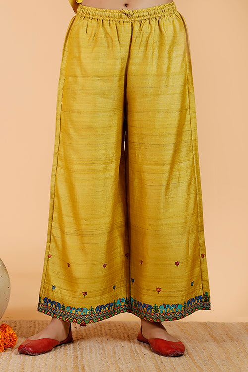Authentic Handpainted Madhubani Pant in Handloom Tussar fabric. Celebrating the grandeur of elephants and peacocks in the forests of Vrindavan. Crafted in a straight silhouette, & woven in fine handloom fabric. Contains an elasticized waist with drawstring, & a side pocket. Mix and match these handpainted pants with as many tops & kurtas as you like to create your own fashion statement. The hand painted product proudly reflects traditional Indian Madhubani art, made exclusively on order by an authentic team of nationally renowned artists, no returns.