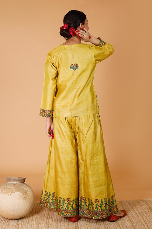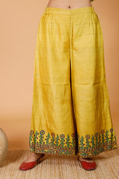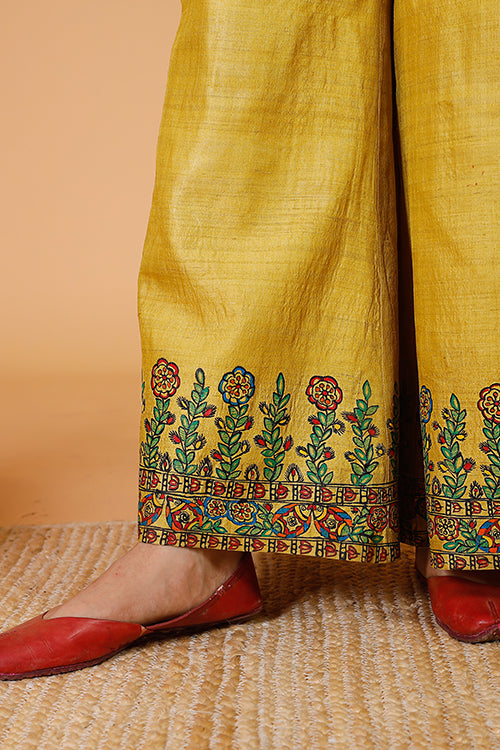 Authentic Handpainted Madhubani Pant in Handwoven Tussar Silk fabric. Bottom hem of the pant depicts intricate artwork of fish-floral 'Sunehri' Madhubani motifs matching with the 'Sunehri Phoolwari' Kurta & Bandi set. Crafted in a straight silhouette, & woven in fine handloom fabric. Contains an elasticized waist with drawstring, & a side pocket. Mix and match these handpainted pants with as many tops & kurtas as you like to create your own fashion statement. The hand painted product proudly reflects traditional Indian Madhubani art, made exclusively on order by an authentic team of nationally renowned artists, no returns.