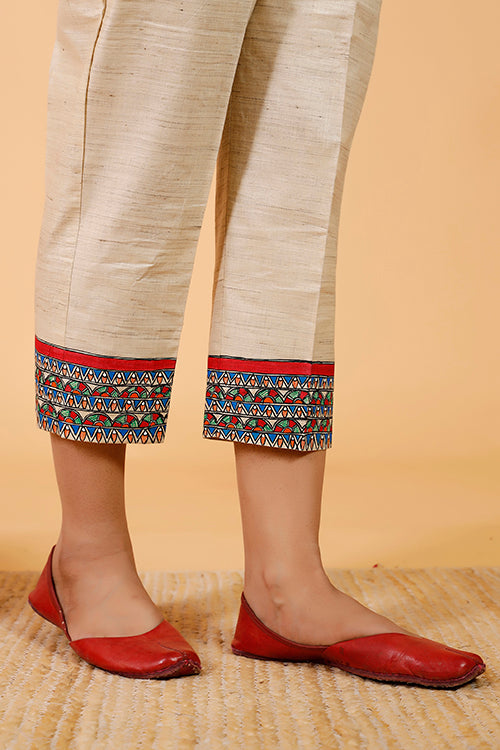 Authentic Handpainted Madhubani Pant in Handloom Cotton fabric. Inspired by the dynamism of fish, & the lotus, which is the epitome of tranquility. Crafted in a straight silhouette, & woven in fine handloom fabric. Contains an elasticized waist with drawstring, & a side pocket. Mix and match these handpainted pants with as many tops & kurtas as you like to create your own fashion statement. Handloom cotton fabric is comfortable all year round, essentially keeping one cool throughout the summers, & cozy in the winters. The hand painted product proudly reflects traditional Indian Madhubani art, made exclusively on order by an authentic team of nationally renowned artists, no returns.