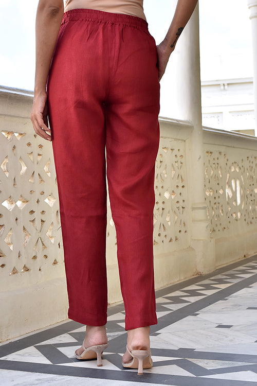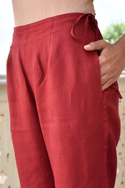 A classic pair of pants for all occasions! We have made this beautiful red ‘Caravan’ pant from pure linen fabric with essential features. The waistband has elastic on the backside and a drawstring in the front to adjust for the perfect fit. Equipped with two pockets for your needs, the contemporary silhouette of this piece will pair wonderfully with kurtas or short tops. Stylish and roomy, these pants can go anywhere!