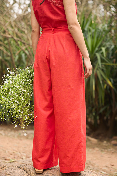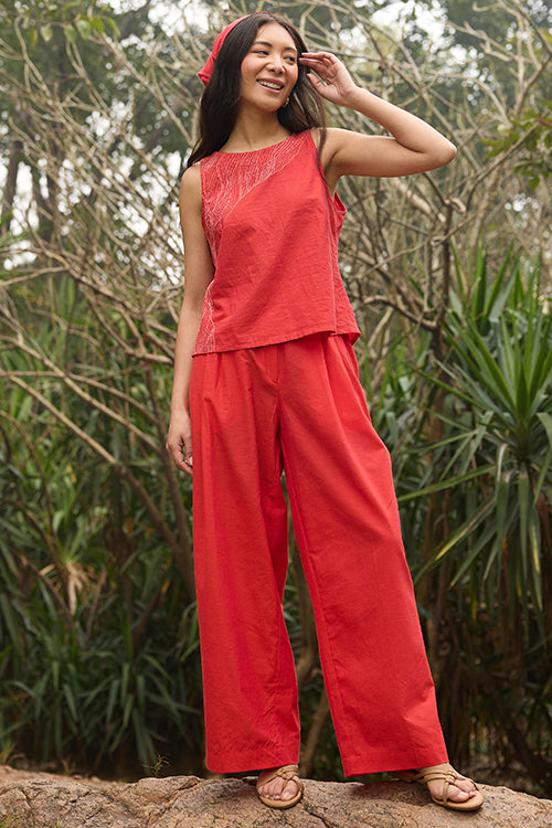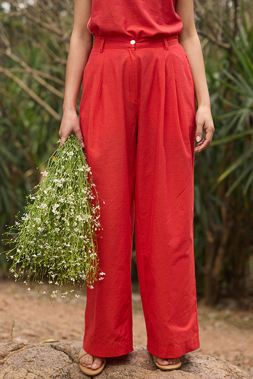 These pure cotton pants are all about understated luxury. With an invisible zipper and a single mother-of-pearl button at the waistband, they offer a sleek, flattering fit that hugs your waist just right. The two pockets bring a touch of practicality, because even in romance, comfort matters. Whether you're strolling through city streets or enjoying an evening out, these pants are as versatile as they are chic. Pair with our matching "Twilight" Hand-Embroidered Pure Cotton Red Top for a classic co-ord red look that exudes confidence, charm, and a touch of magic.