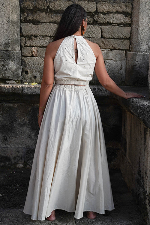 Embody the essence of quiet festivity with the "Shining Armour" skirt, a timeless piece in off-white pure cotton. This free-size skirt is designed for effortless elegance, with an elasticated waist and adjustable drawstring ensuring a comfortable, personalized fit. The minimalistic design exudes versatility, making it a graceful foundation for any celebratory look. Thoughtfully designed with two side pockets, it offers both style and convenience.