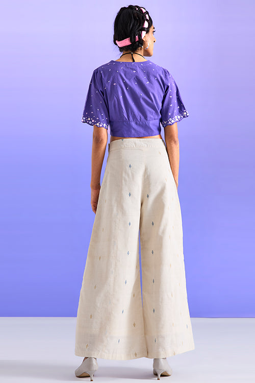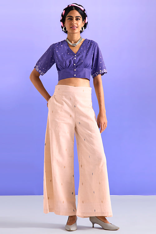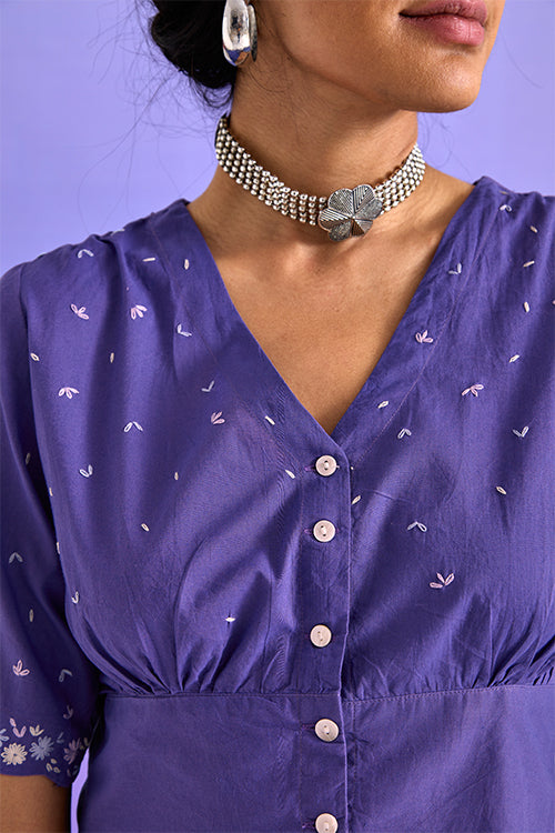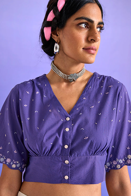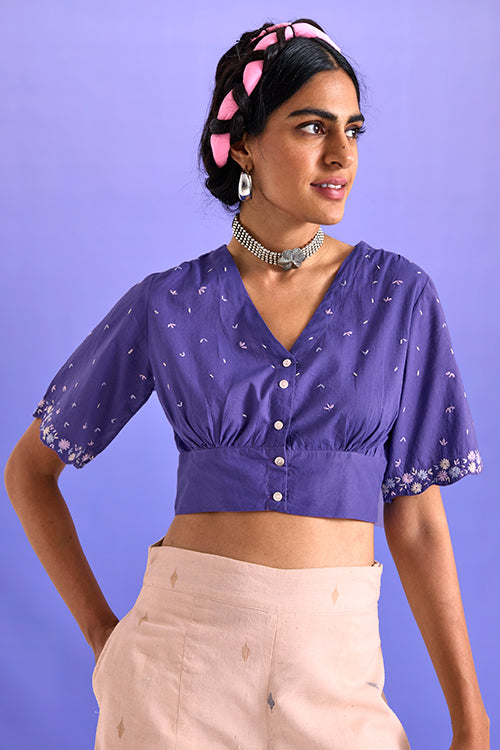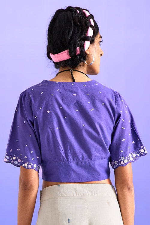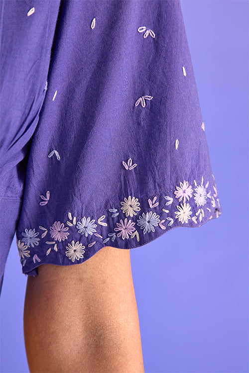 Cherish yourself with our all-new hand-embroidered top, 'Graceful'. Crafted from the softest pure cotton fabric, this purple ensemble has a beautiful V-neckline along with a waistline accompanied by double-layered fabric. To accentuate the look there are gathers on the shoulder and wavy curved sleeved edges. The intricate embroidery features lazy daisy stitches in the front, back and along the sleeves. For your utmost comfort, we have added MOP buttons in the front for an opening. Pair these with your favourite white pants or get experimental by wearing it with a saree too! The possibilities are endless!
