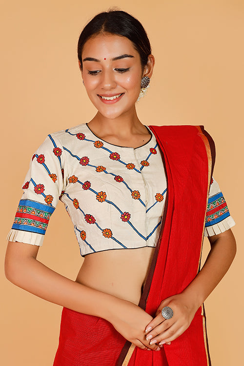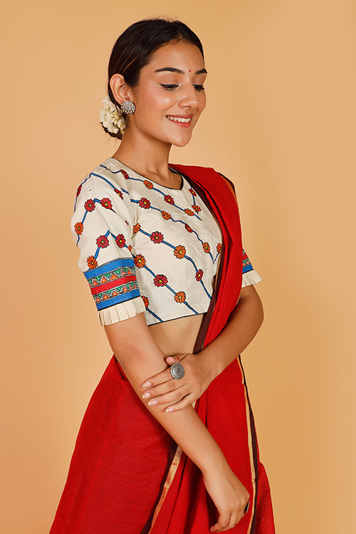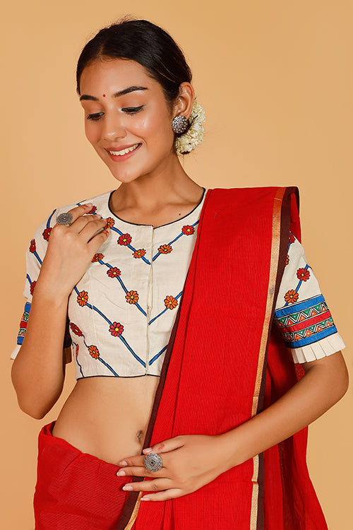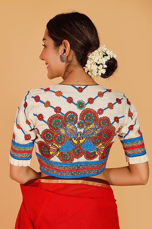 Gubbaro handpainted blouse is crafted with the utmost care in pure handwoven Moonga silk fabric, ensuring comfort. The back of this blouse depicts vibrant mayur, in all its glory. The front, & the sleeves are decorated with floral motif patterns & Madubani borders. This half sleeve blouse features a round neck cut & is tailored with a side zipper opening. You can pair it with a number of colorful sarees which makes it a must have in your wardrobe. The hand painted product proudly reflects traditional Indian Madhubani art, made exclusively on order by an authentic team of nationally renowned artists, no returns.