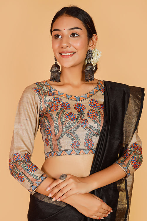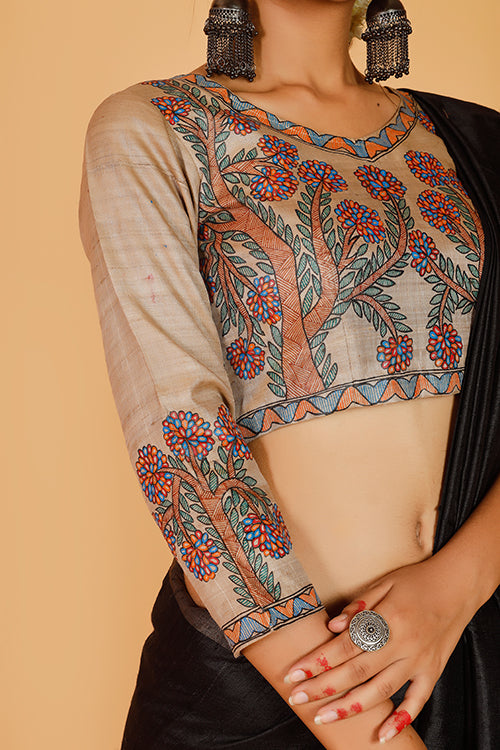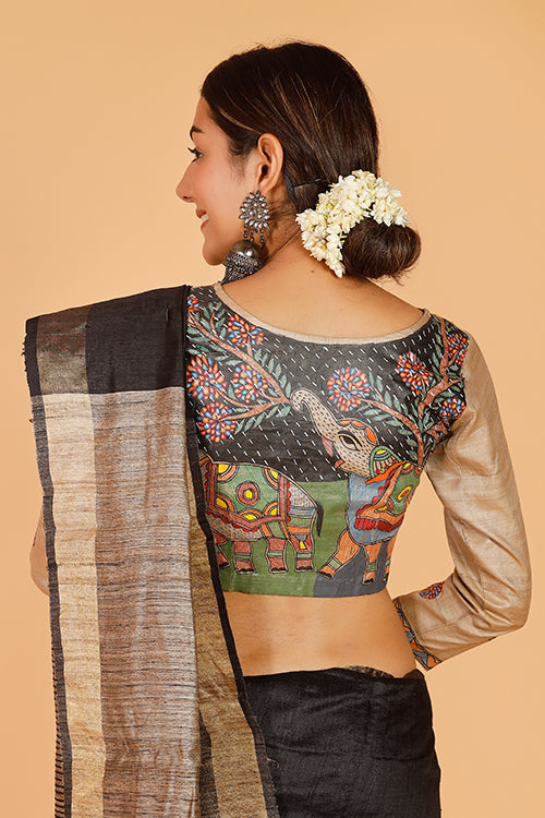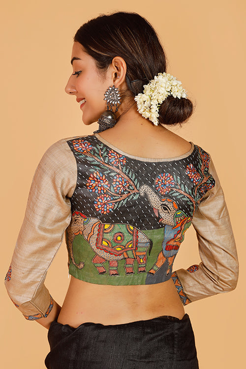 Authentic Handpainted Madhubani Blouse. Featuring detailed handpainted Madhubani design all over the blouse on Tussar Silk Fabric. Here, on our blouse we have depicted, via Madhubani Handpainting, the Long Lost Elephants of Sri Krishna's era. On the front, & the sleeves of blouse, Trees from Vrindavan forest have been depicted, while the back depicts elephants enjoying in the rain. This 3/4th sleeve blouse is tailored with a side zipper & a round neck. No Returns. Exchange for a different size of the same product is allowed in case of a size misfit.