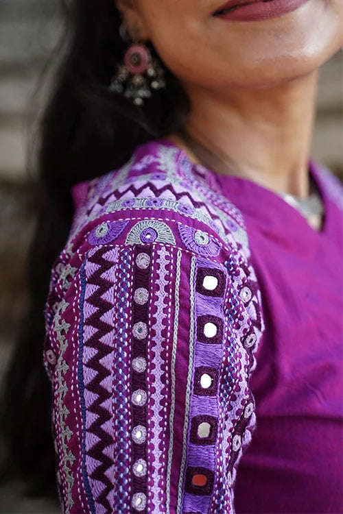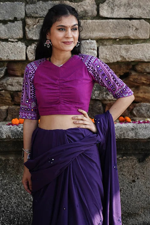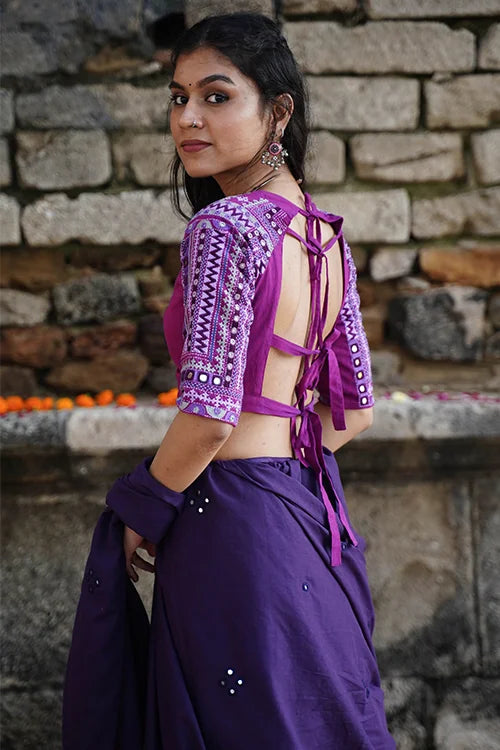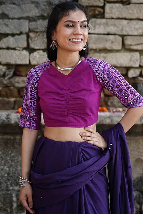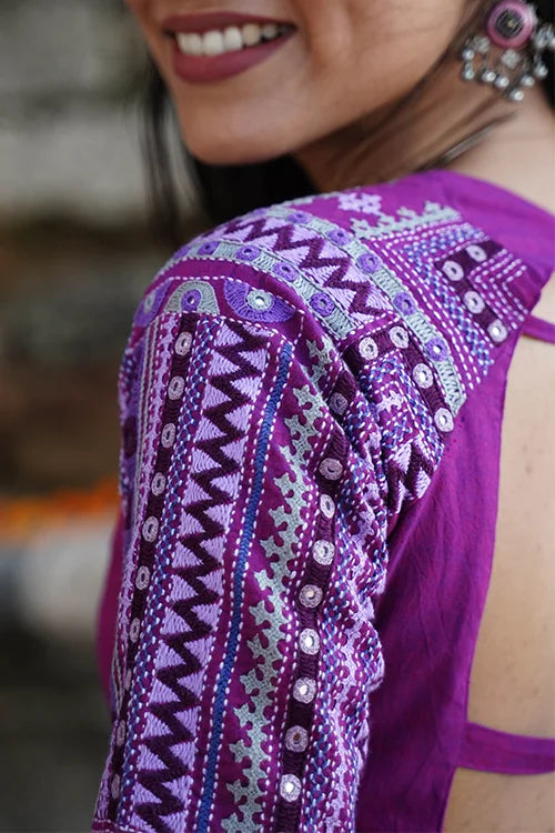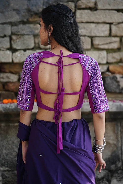 Bold and striking, this backless Okhai "Amethyst" blouse in deep purple exudes confidence. Crafted from soft, pure cotton, it features beautifully embroidered sleeves with running, chain, bavadiyo, and stem stitches, each one thoughtfully placed to create a fluid, artistic design. The mirrors woven into the embroidery catch the light, adding a touch of sparkle with every movement. The open back enhances its daring appeal, making it a statement piece for any festive occasion. Pair it with a lehenga or high-waisted skirt, and you’re ready to turn heads with its perfect blend of tradition and modern flair.