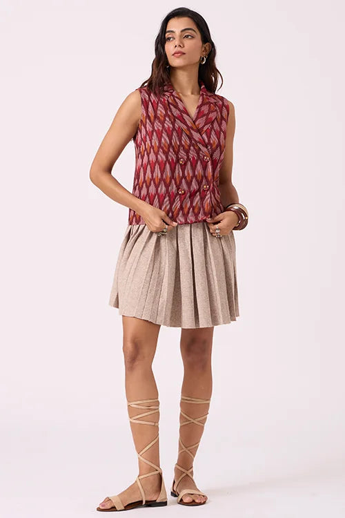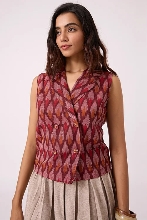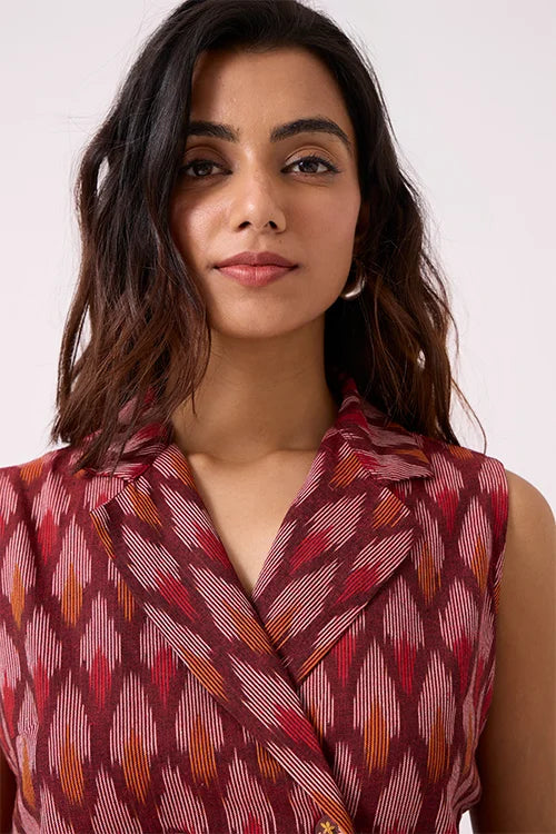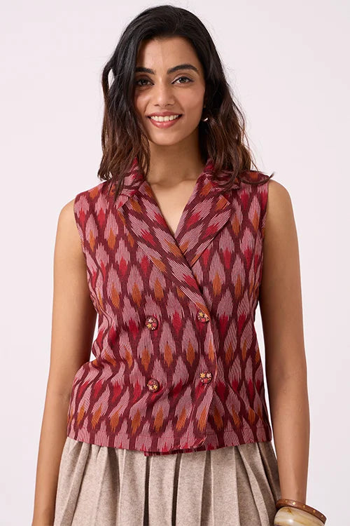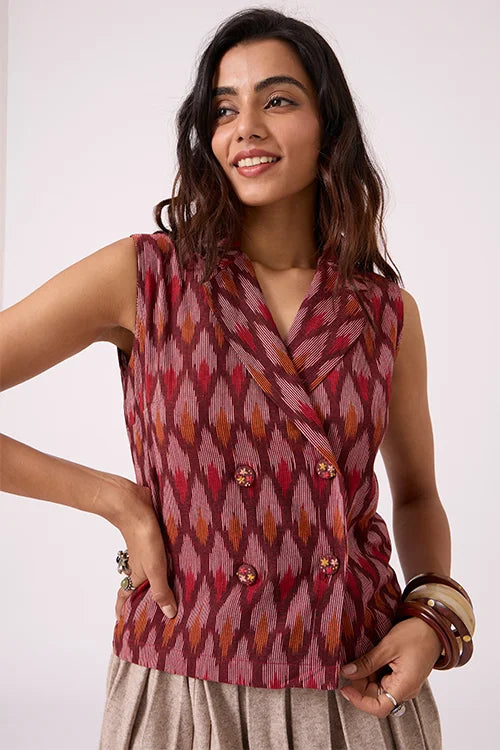 Our sleeveless maroon Ikat top is a standout piece. Featuring a structured collar and an overlapping front, it has a tailored finish, secured with four bold wooden buttons—each hand-covered in matching fabric. What truly sets it apart is the intricate embroidery on the buttons, with fine French knots and lazy daisy stitches, all hand-done by skilled artisans. The top pairs well with pants, skirts, or can be layered under a jacket for a chic Indo-Western look. Whether you're heading to a meeting, a festive brunch, or a cultural event, this top adds just the right twist. Style it with statement earrings for a dressy look or cotton trousers for something more relaxed—versatile and unique, it's crafted to stand out.