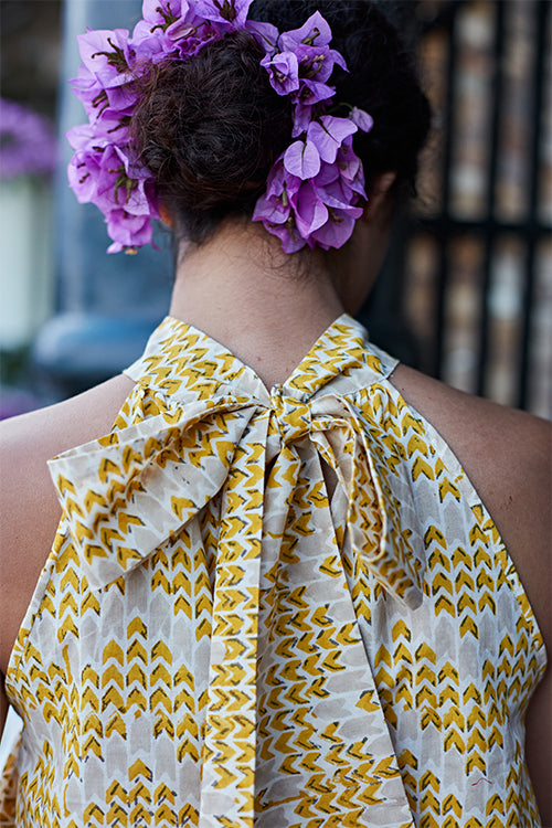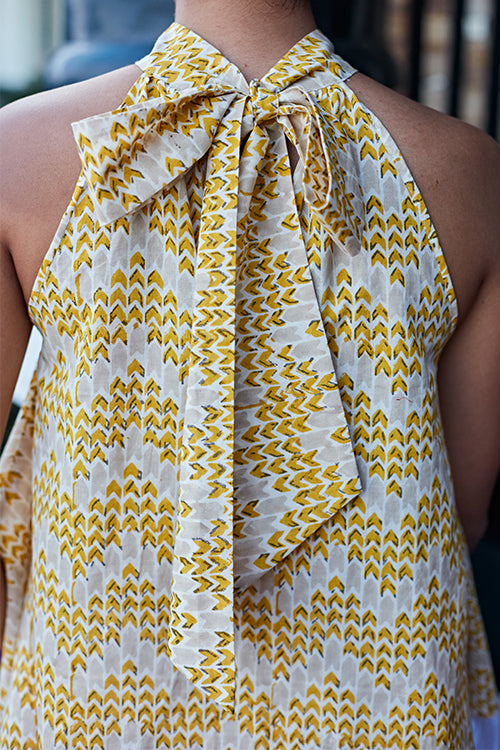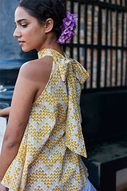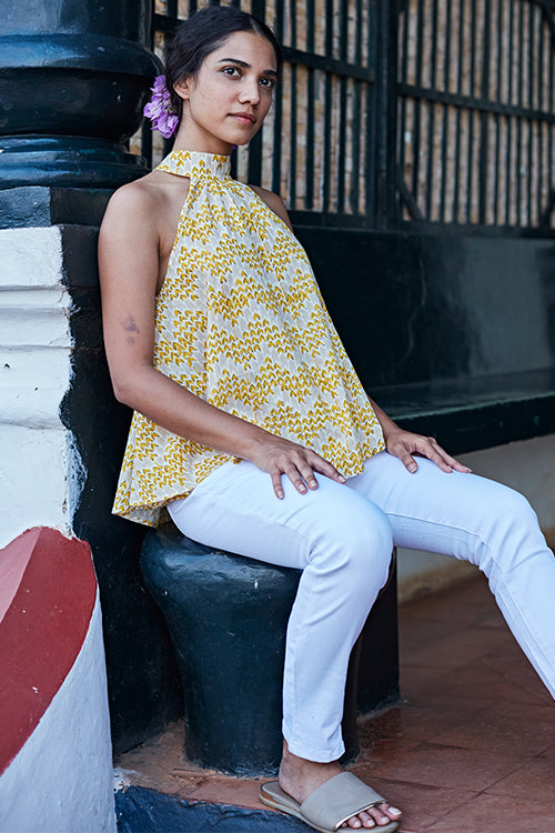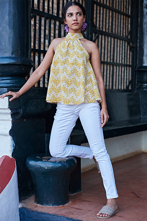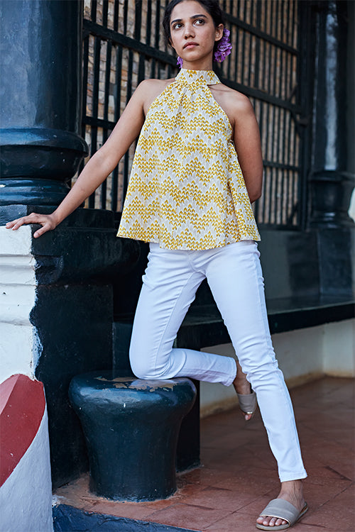 A stylish summertime top for the everyday woman! Our ‘Buttercup’ possesses all the ingredients to make heads turn and leave a lasting impression. Made in a lovely canary yellow colour, the unique print gives it an edge over your regular tops. The attractive halter neck style lets you show off your shoulders. Enjoy styling this top with white pants and heels for workwear. And pair it with wedges or flats for a casual look with friends. Introduce this classy piece to your wardrobe now!