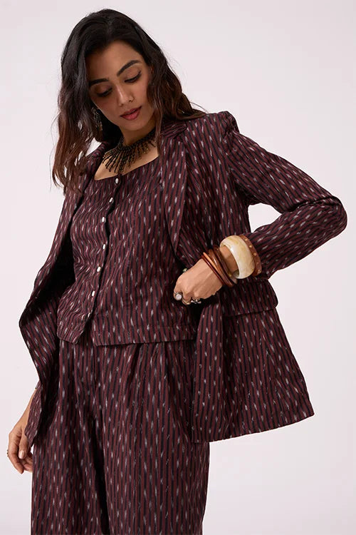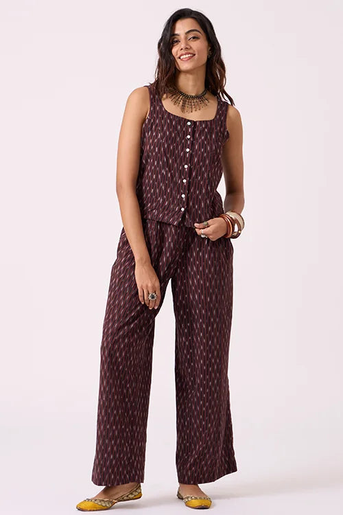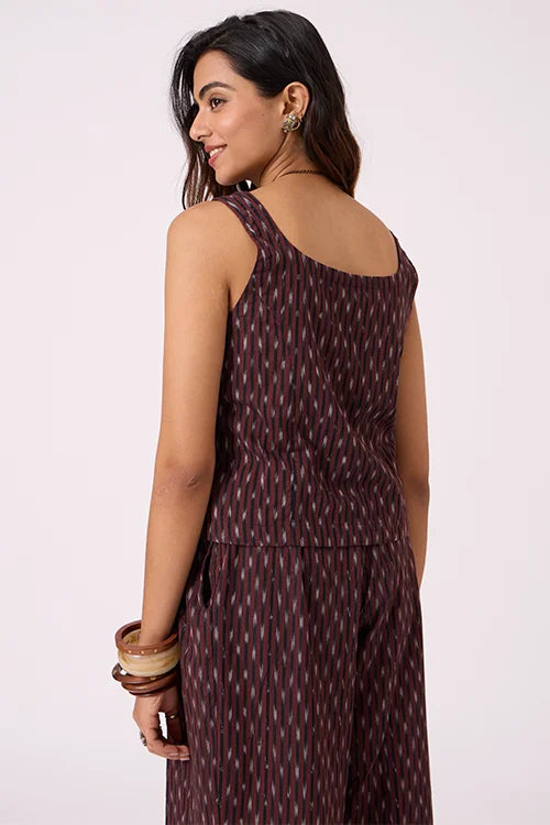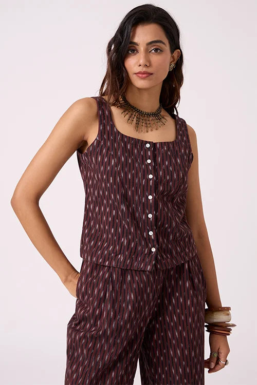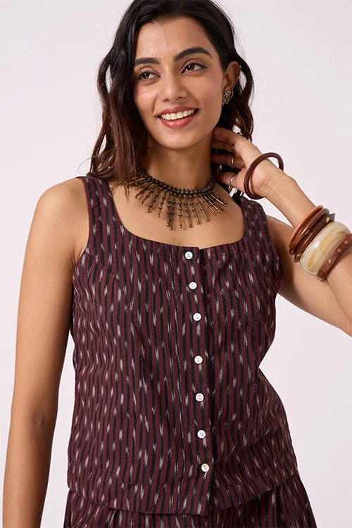 Elevate your everyday style with this elegant sleeveless Ikat top in a warm brown hue. Crafted in handwoven Ikat, the top features a functional front placket adorned with delicate Mother of Pearl (MOP) buttons, adding a subtle touch of sophistication. Designed for both comfort and versatility, it's perfect for pairing with jeans, skirts, or layered under a jacket for a fusion look. Ideal for casual outings, festive layering, or office-chic styling.