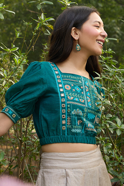 The Okhai “Eden” blouse wraps you in the comfort of tradition, elevated by hand embroidery and mirrorwork. In a rich rama green, the pure cotton fabric feels light yet substantial, with double layers that add depth. Intricate stitching adorns the yoke, cuffs, and back, while elastication at the waist creates a flattering silhouette. The MOP buttons and loops at the back offer a touch of vintage charm. Pair it with a flowing skirt for a relaxed look, or tuck it into trousers for a more refined feel—this blouse effortlessly combines heritage with modern ease.