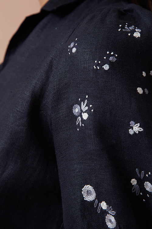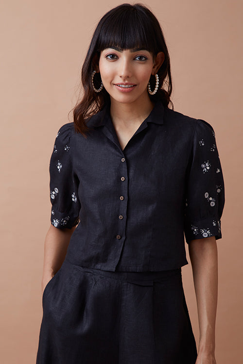 Mighty' is a classic black shirt that you can never go wrong with. Adorned with floral embroidery on the sleeves in hues of grey you can easily carry this shirt to work or a night out in the city. Crafted from linen fabric this shirt has a small notched and a functional placket collar to give it a formal touch. Pair it with high waist pants and heels for a formal look or with your favorite jeans for a casual look it will rock in every style!