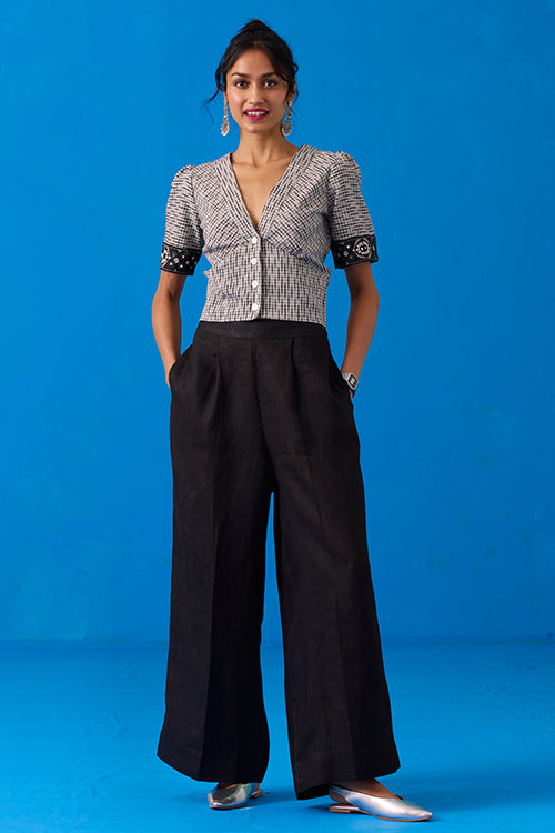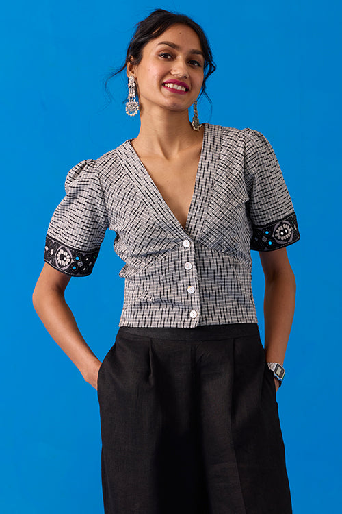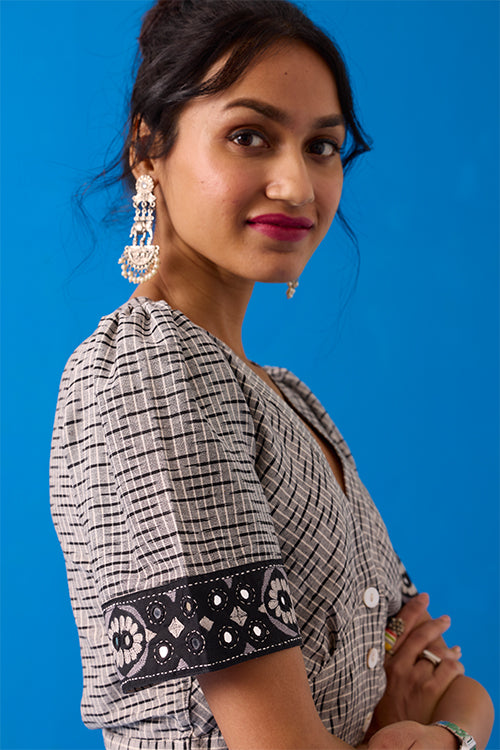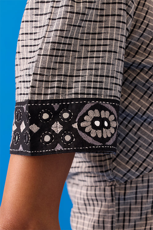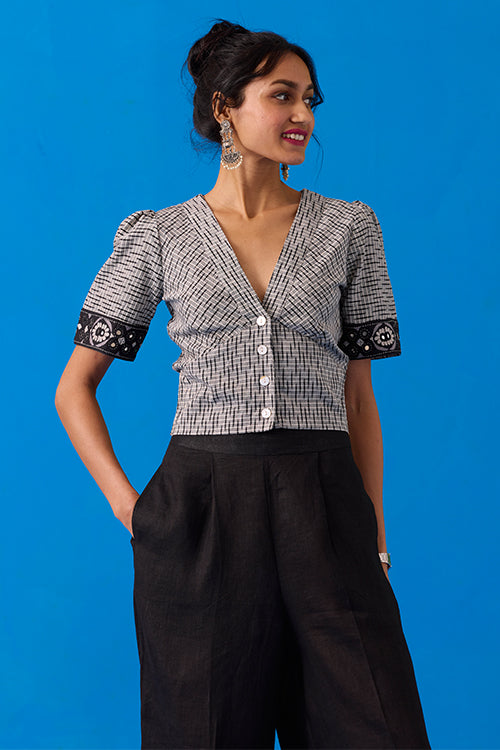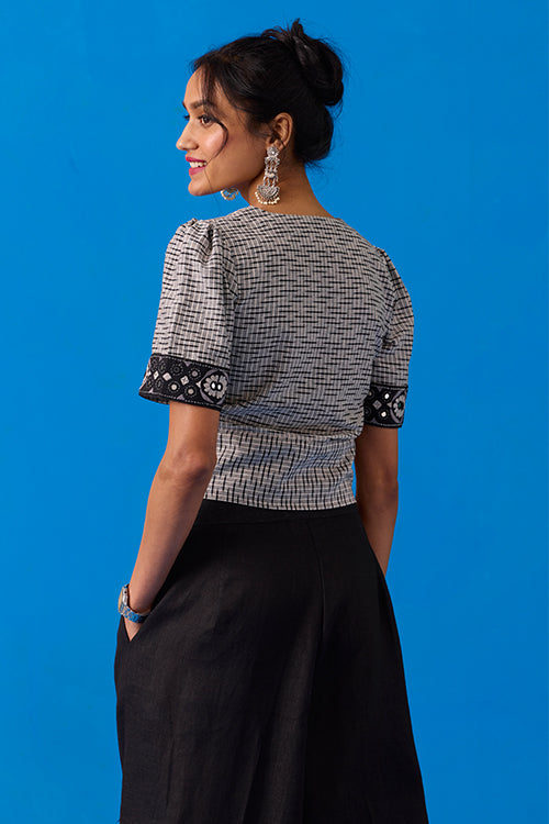 The “Chilika” Top is an artful expression of Ikkat’s bold energy. In striking black and white, the fabric tells its own story, while the hand-embroidered cuffs add a layer of depth with satin stitches, mirrors, and intricate detailing. The black patch on the sleeves speaks volumes in its quiet elegance, while the MOP buttons offer a simple yet functional finish. Pair it with sleek trousers or a flowing skirt, and let its beauty shine through in the details. Perfect for a day that calls for grace without effort.