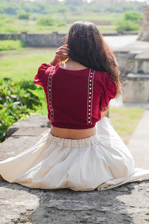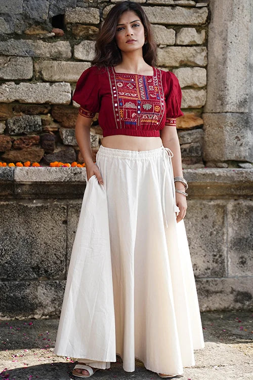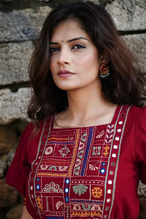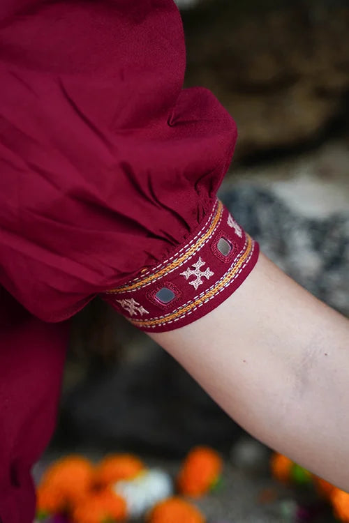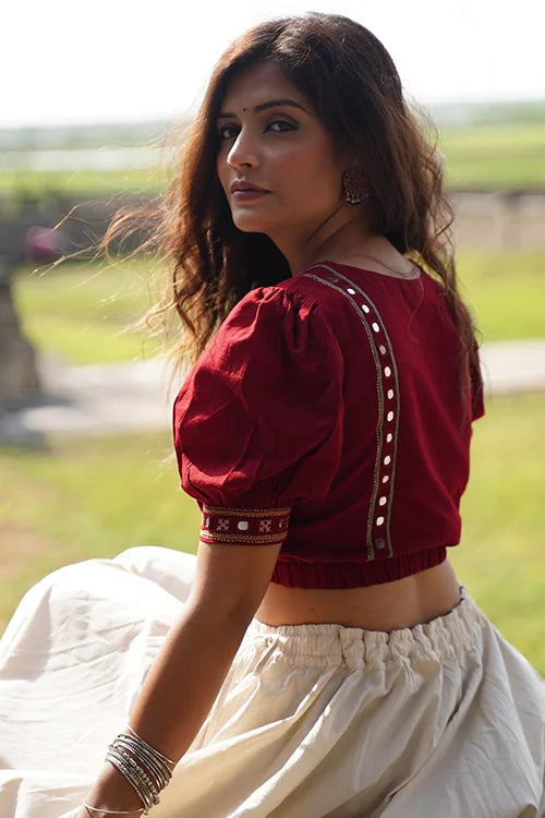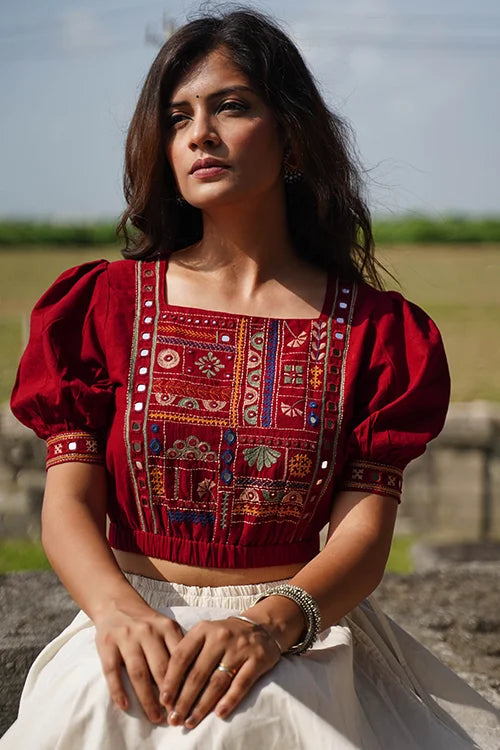 Embrace the rhythm of Navratri in the "Raas-Garba" blouse, where every stitch dances to the tune of tradition. Cloaked in a bold brick red, this pure cotton piece is a canvas of exquisite hand-embroidery and glimmering mirrorwork. The double-layered front and back create a flawless silhouette, while the intricate detailing on the front yoke, sleeves, and back add an artistic flair. An elasticated waist, offer both elegance and comfort. Pair it with your favorite festive skirt or high-waisted pants, and let this blouse be your statement piece for the season.