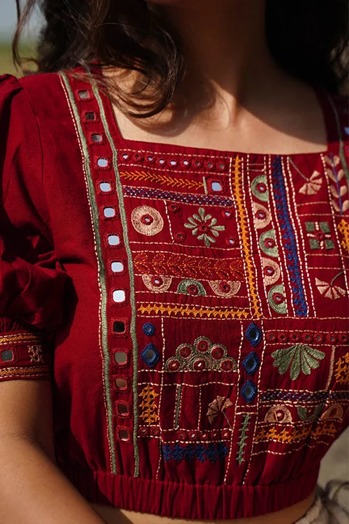 Okhai "Raas-Garba" Hand-Embroidery and Mirrorwork Brick Red Pure Cotton Blouse