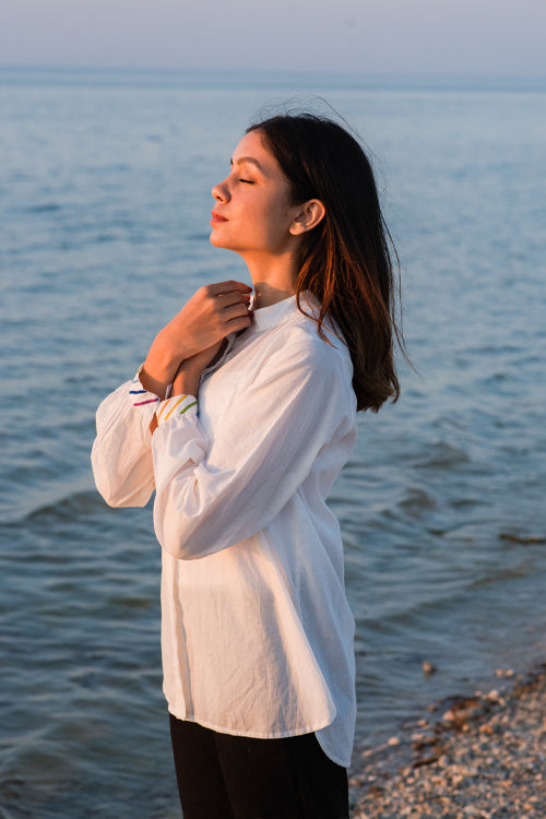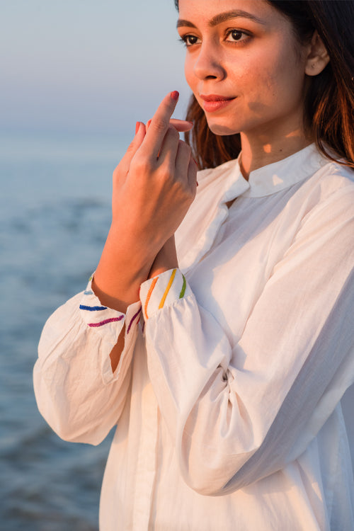 The greater your storm, the brighter rainbow. Hand embroidered rainbow on the classic cotton shirt. This shirt with a stand collar and concealed placket can be paired with jeans, palazzos and formal trousers. Easy to style, effortless and chic, this design can transition from casual to formal to a party to ethnic with a simple switch in accessories. Note: depending on your personal preference, this design may need to be worn with a slip as it is airy Cotton Cambric.