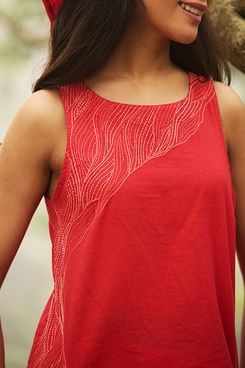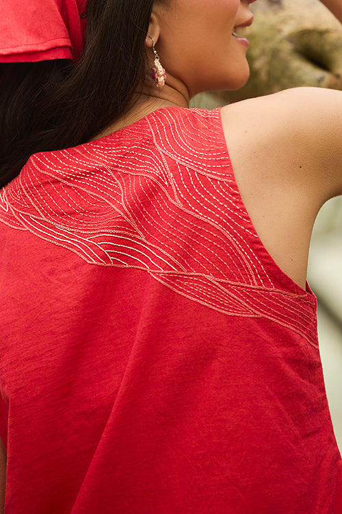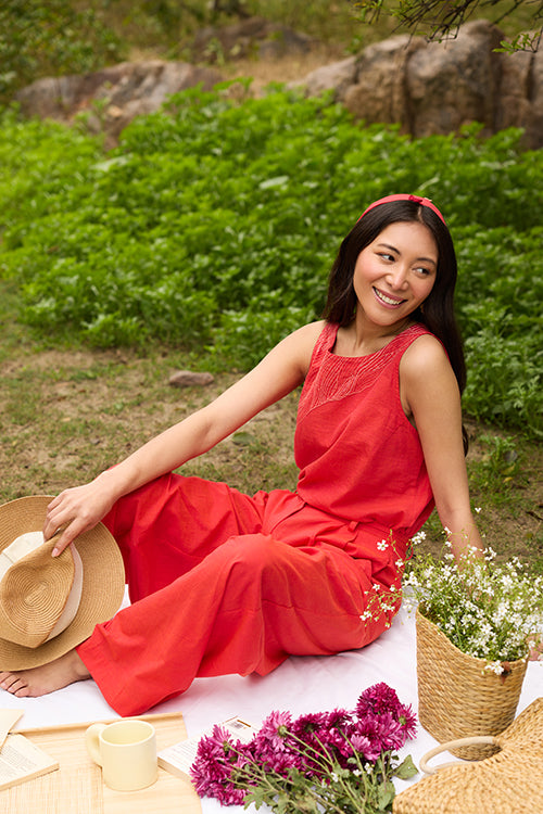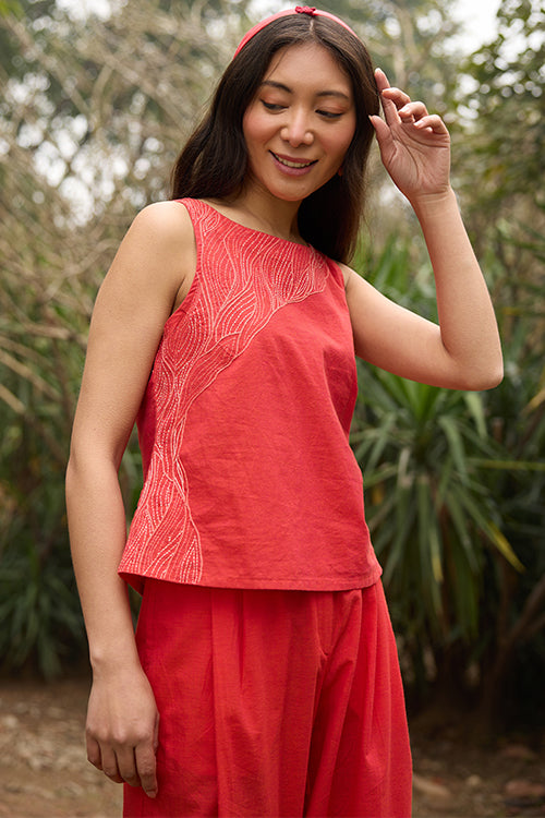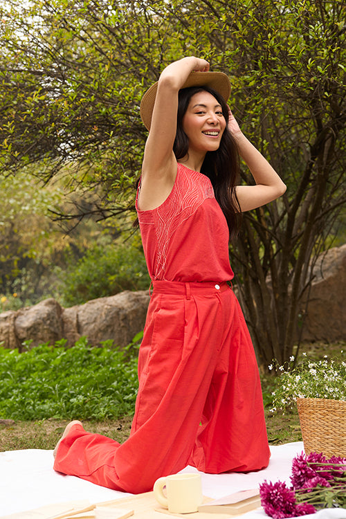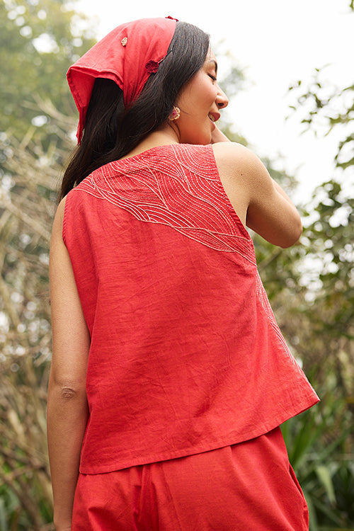 This sleeveless pure cotton top in striking red is made for moments that turn into memories. Embroidered with delicate stem, chain, and running stitches on the front and back, it carries the essence of artisanal love—every thread a whisper of craftsmanship. The breezy, cropped silhouette adds just the right touch of flirtation, making it the perfect pick for sundown strolls and starlit soirées. Pair with our matching "Meadow" Red Pants for a chic co-ord look that turns heads.
