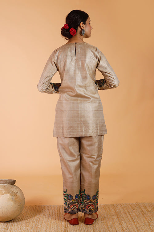 Authentic Handpainted Madhubani Kurta in Handloom Tussar fabric. Mithila is known for its flowers throughout history since the culture of Vedanta, & the time sof Ramayana. Inspired by an enchanting aura of flowers present in nature. NOTE: Model is wearing size S (bust 36). The hand painted product proudly reflects traditional Indian Madhubani art, made exclusively on order by an authentic team of nationally renowned artists, no returns.