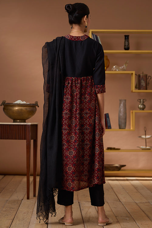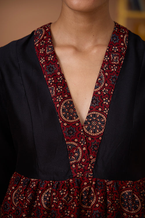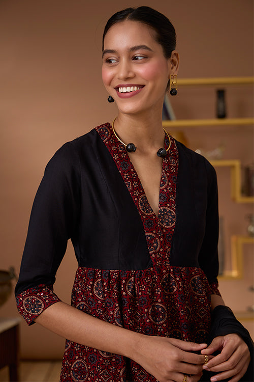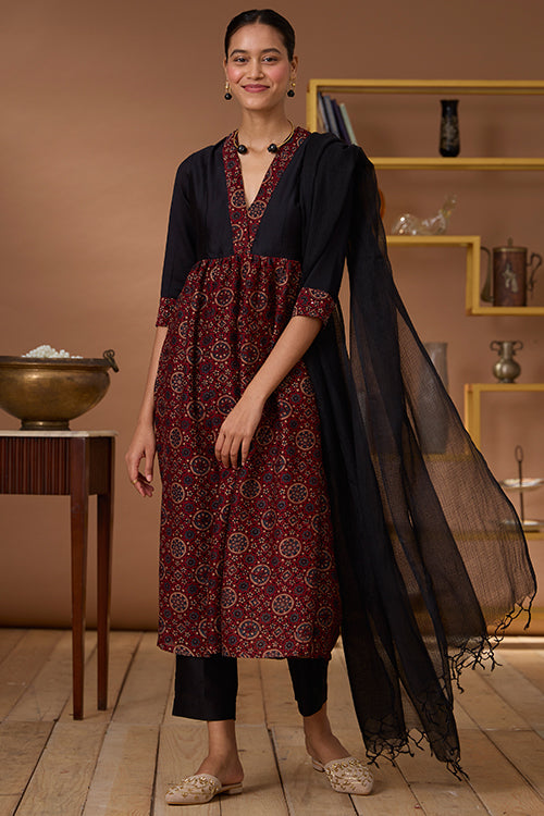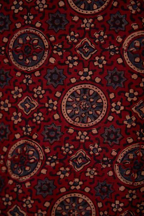 This garment is a final sample and for size and fit please refer size chart. Go through the wash care below carefully. Returns and exchanges are not possible on sample sale. Fabric Type: Hand Block Printed Chanderi Silk Ajrakh Wash Care: We use natural dyes in some of our products, since dark colours tend to run dry cleaning is recommended. The first few times wash in cold tap water, wash inside out and dry in shade. Use mild detergents only.