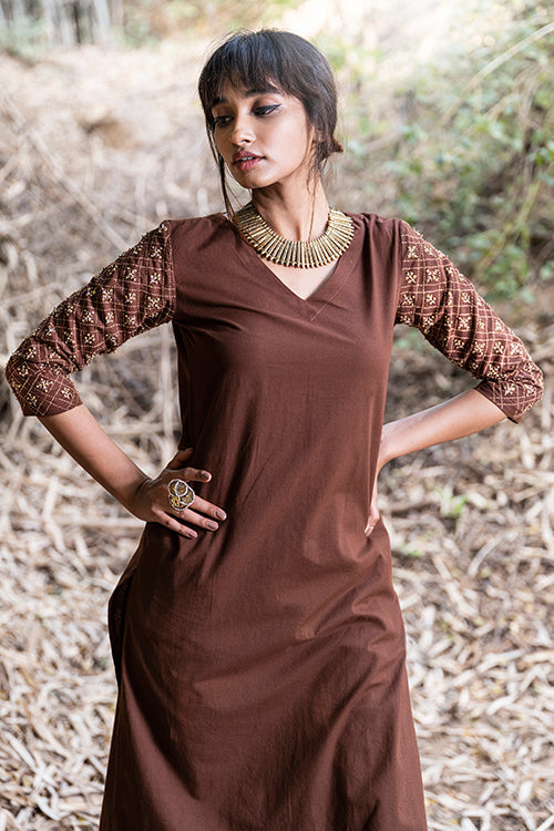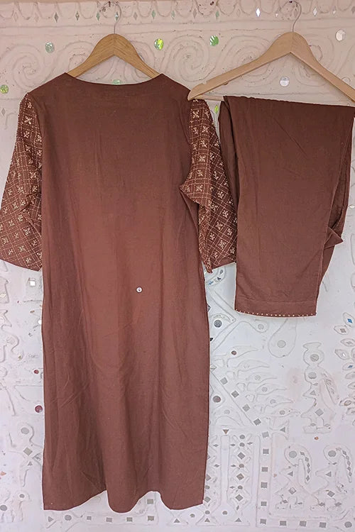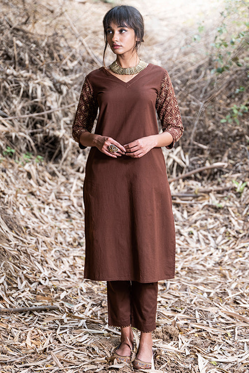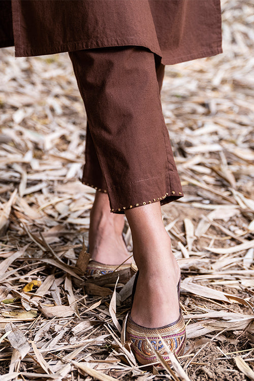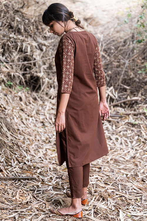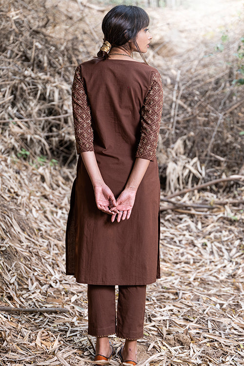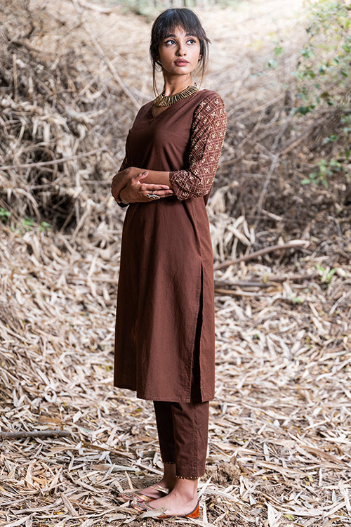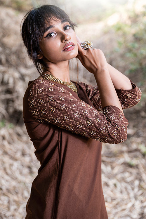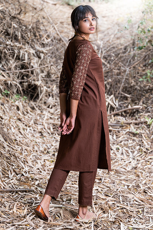 Auburn Glow is made up of a kurta and pant, crafted on a soft and lightweight pure cotton fabric. The exquisite kurta is decorated with dazzling beads and sequences of embroidery on both the sleeves which adds beauty to the set. Shoulder loops with press buttons and two slits are added to the kurta to provide you with supreme comfort. The brown pants that come along with the set feature two pockets, an elastic at the back and a drawstring, all around for your convenience. You can pair this with a dupatta or mix and match with contrasting kurta or pants to style in various unique ways. 'Auburn Glow' is an array of beads, and hand embroidery all over to match your mood, for you to wear at any special event effortlessly.