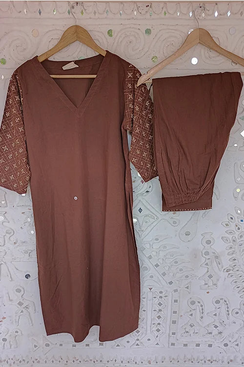 'Auburn Glow' is a beautiful kurta pant set, that is an attention-grabber every time you wear it. It has a nice look, with stunning symmetrical designs. The lovely brown colour will make you shine literally in the company of all your friends and family.