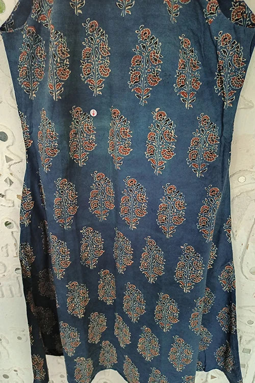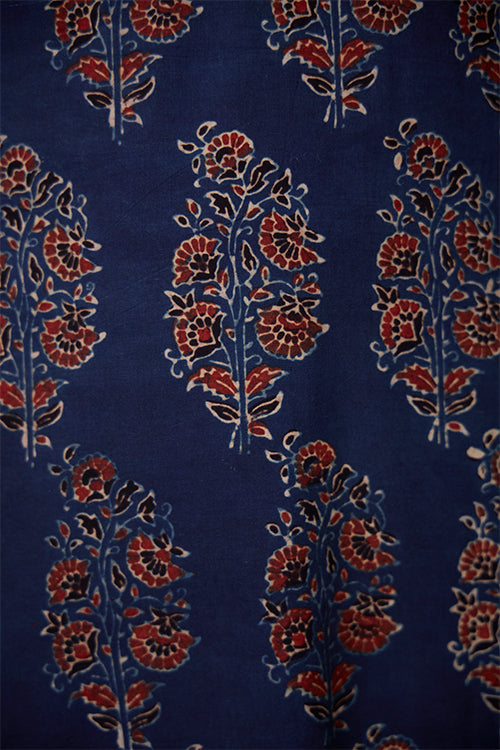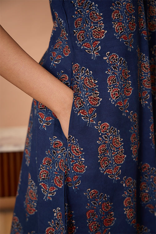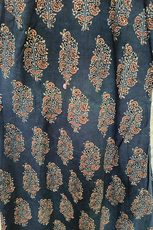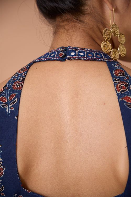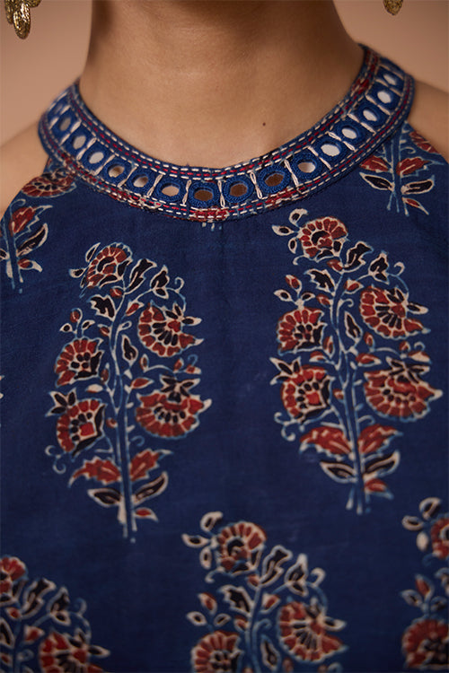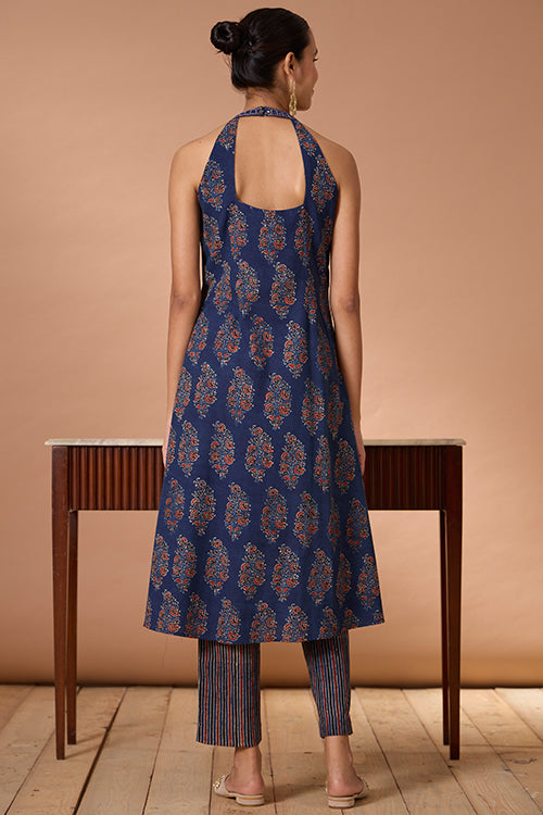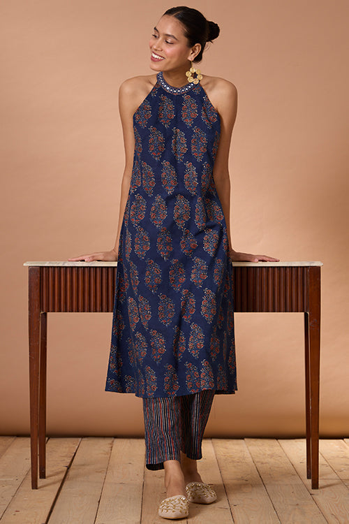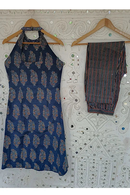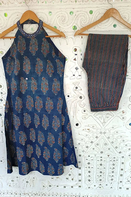 We are here to give you princess treatment by decking you up in our “Evening Lily” Kurta Pant Set. Paying homage to the old traditions of Kutch and Sindh, the dark blue pure cotton canvas boasts exquisite hand-block printed floral motifs. Channel your feminine energy with the flattering haltered neck kurta and a glimpse of your back with Potli buttons for closure. Drawing your eyes to the intricate hand embroidery work, the neckline is embellished with square-shaped mirrors with running and laisy daisy stitches. The pair of pants, in an amusing striped print, come with darts at the front and elasticated at the back. Ditch your purse for you can store your essentials in the 2 pockets of the kurta. With some statement earrings, juttis, and our “Evening Lily” on, you are set to look absolutely ethereal!