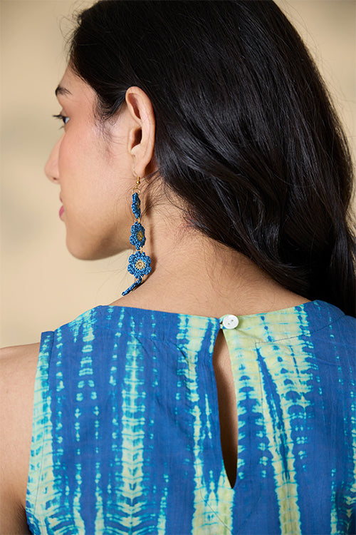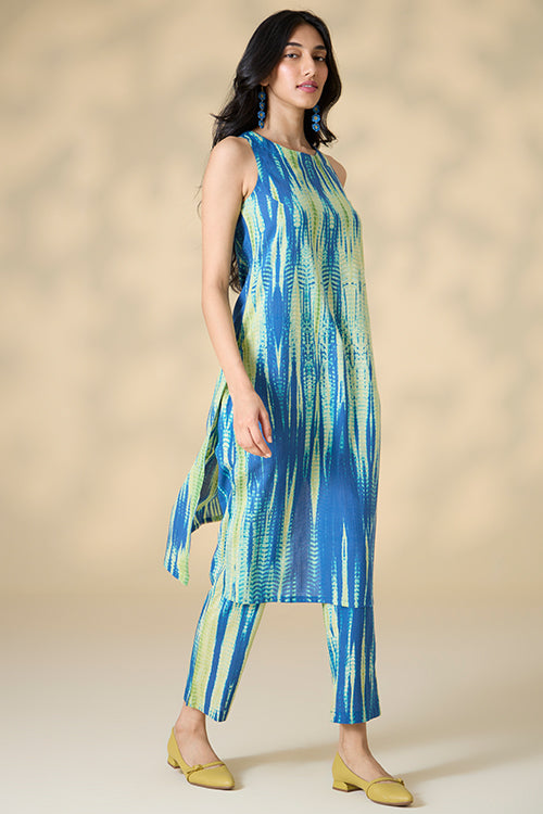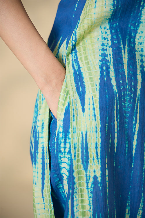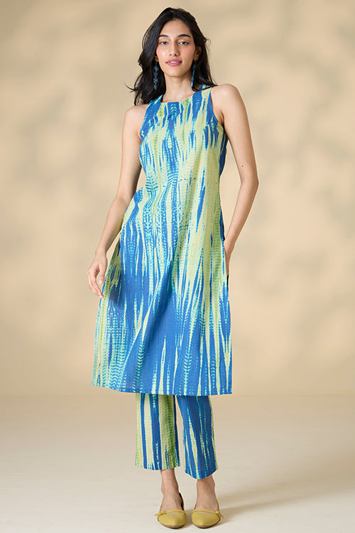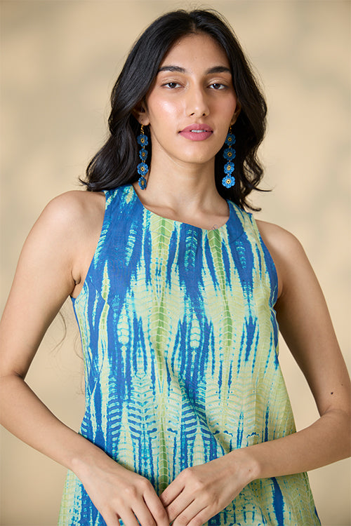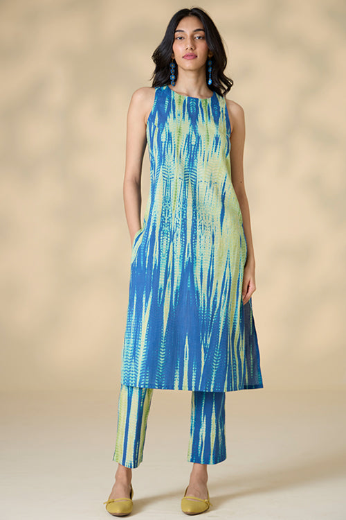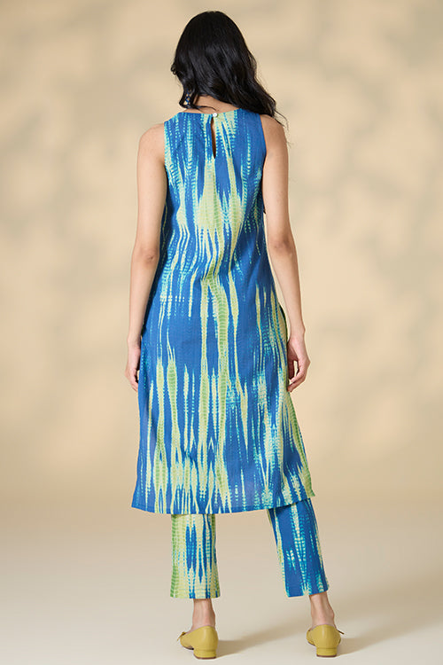 Our "Capri Shores" Kurta Pant Set features vibrant blue and green hues, created through an exquisite tie-and-dye technique on pure cotton fabric. This handcrafted set includes a sleeveless kurta with elegant potli buttons and loop closure at the back, plus convenient press buttons on the shoulder straps. Designed for comfort and style, the kurta has two side slits for easy movement. The matching pants come with two side pockets, perfect for keeping essentials close. Ideal for summer strolls or office wear, this kurta pant set combines artisanal craftsmanship with contemporary design, making it a versatile and stylish addition to your wardrobe.