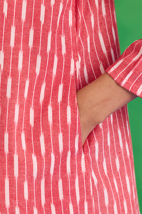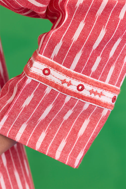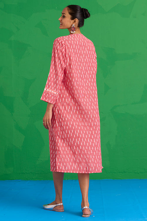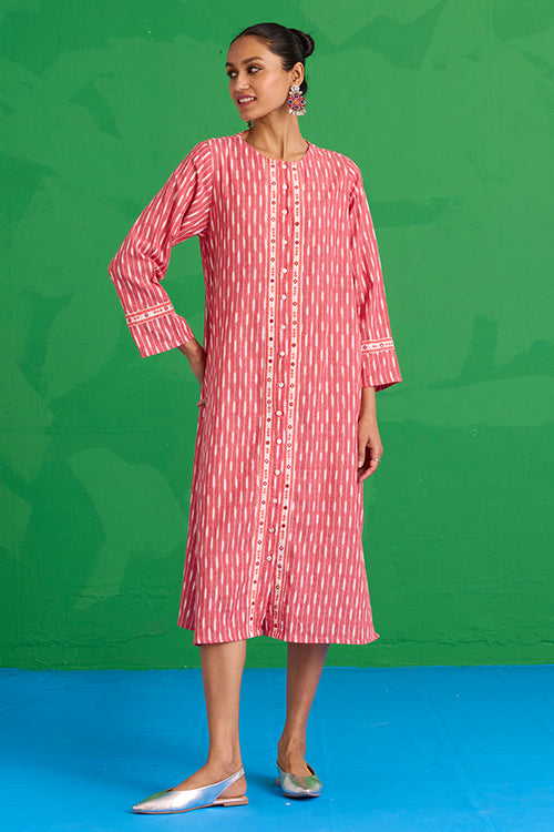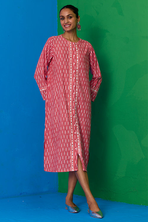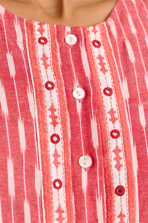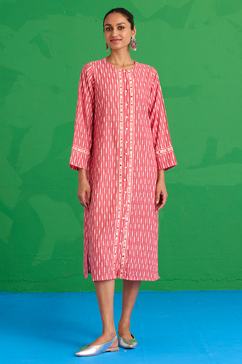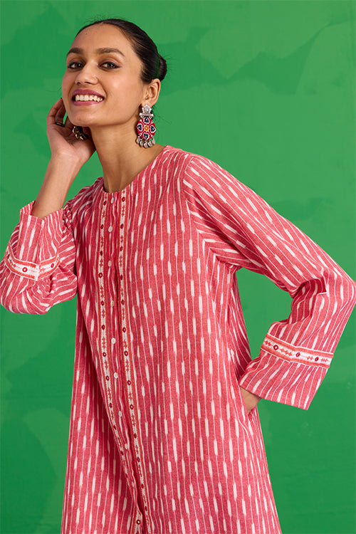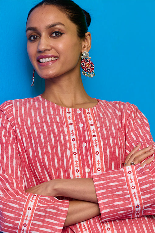 Grace takes center stage with the "Kaveri" Ikkat Kurta, a celebration of artistry in soft pink pure cotton. The kurta features intricately embroidered patches on the front and sleeves, brought to life with bavadiyo stitches, running details, and mirrors that sparkle with every move. A functional placket adorned with MOP buttons adds a touch of refinement to its traditional silhouette. Perfect for daytime events or a polished workwear look, this kurta is a testament to timeless craft and contemporary charm.