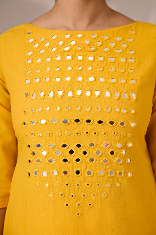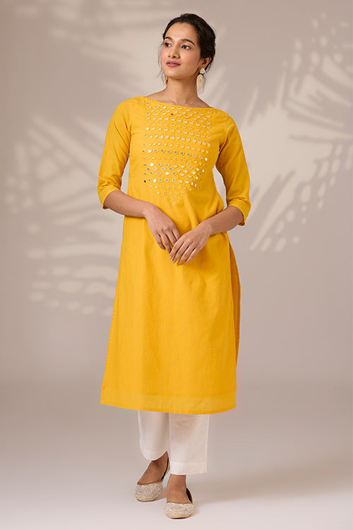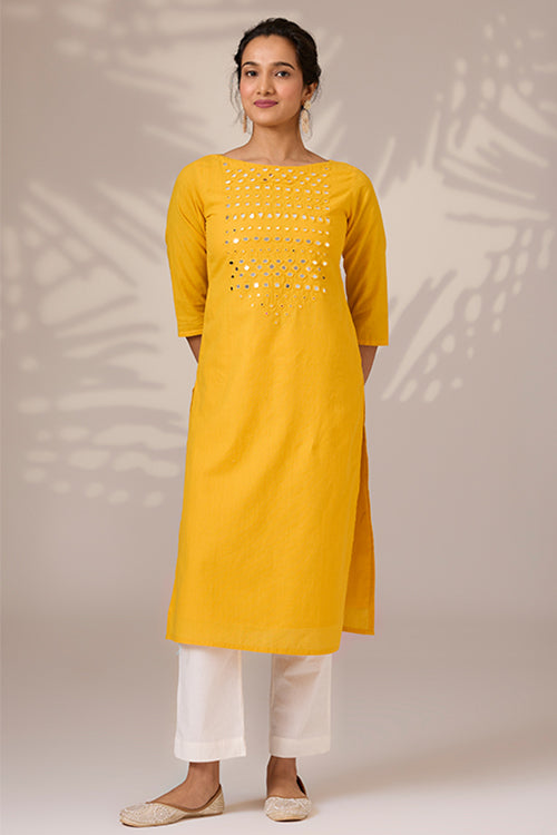 Stunningly simple but is sure to draw you compliments, is our "Sunbeam Shine" long kurta. Handmade from pure cotton, it's an absolute visual treat- with its warm yellow hues and square, round, diagonal, almond-shaped mirrors on the front yoke. It comes with a soft cotton mul lining underneath for the entire garment, excluding the sleeves. Utility intact, it's got shoulder straps with press buttons and 2 pockets on the sides. It's complete the traditional 2 slits on the sides. Eye-catching and effortlessly stylish, "Sunbeam Shine" is going to be the kurta you reach out for every occasion!