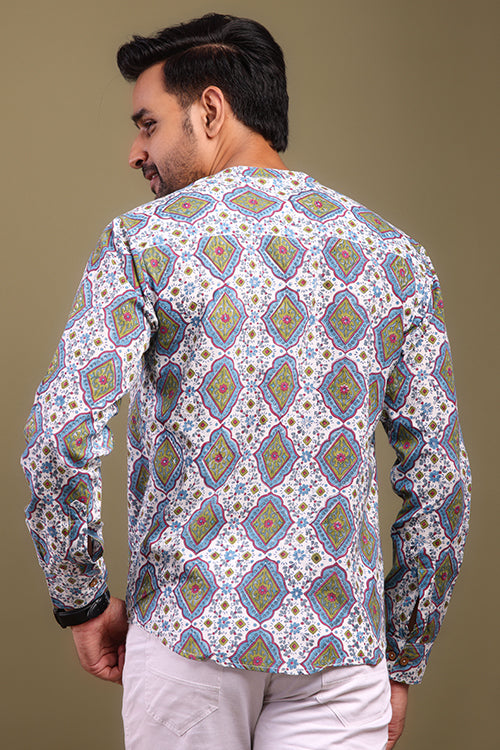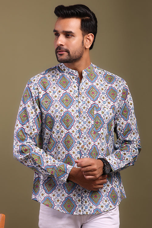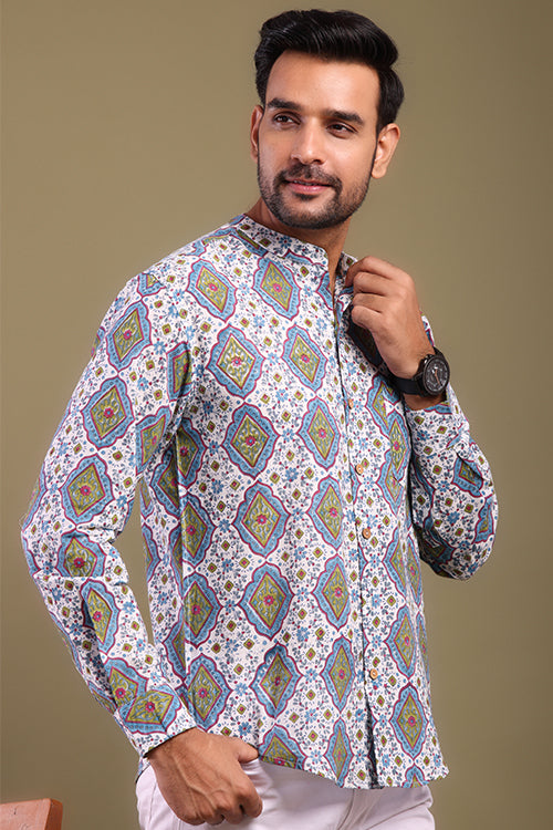 Made from premium quality cotton fabric, this cool blue-green printed shirt provide an elegant feel, ensuring all day comfort and breathability. With a perfect blend of contemporary design patterns and vibrant colors, it appeals to the modern man with a taste of individuality. With a perfect blend of contemporary design patterns and vibrant colors, it appeals to the modern man with a taste of individuality. Pair these statement shirt with tailored trousers for a sophisticated look, or dress them down with jeans for a more casual yet fashionable ensemble. The possibilities are endless, allowing you to experiment and create your own signature style.