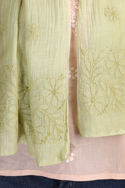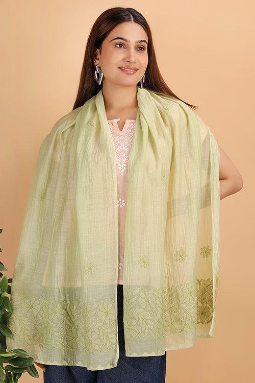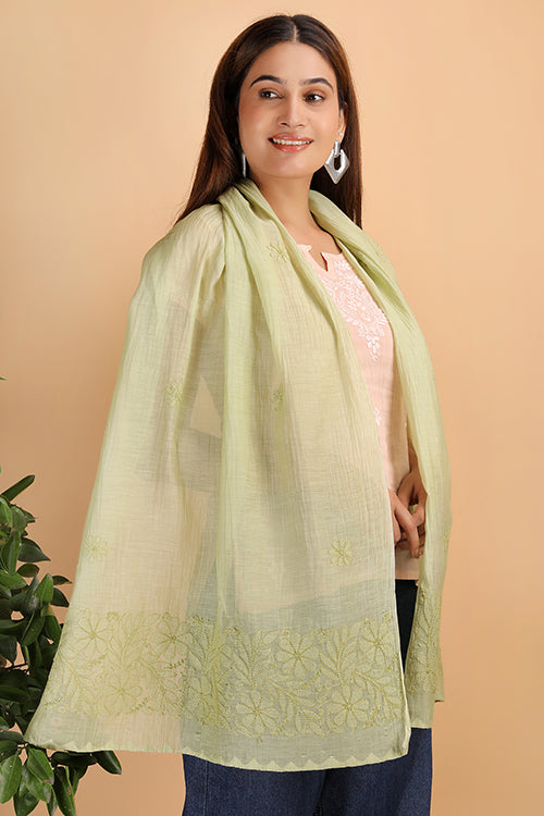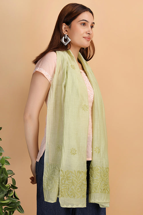 Enhance your ensemble with this Shwet women’s green Chikankari Chanderi stole. Made from exquisite Chanderi fabric, this stole offers a light, airy feel with a subtle sheen. The rich green color is beautifully complemented by intricate Chikankari embroidery, meticulously hand-stitched by skilled artisans. Ideal for adding a touch of traditional elegance to both casual and formal outfits, this stole is a versatile accessory that can be draped over a kurta, dress, or even a simple top, bringing a sophisticated and timeless charm to any look.