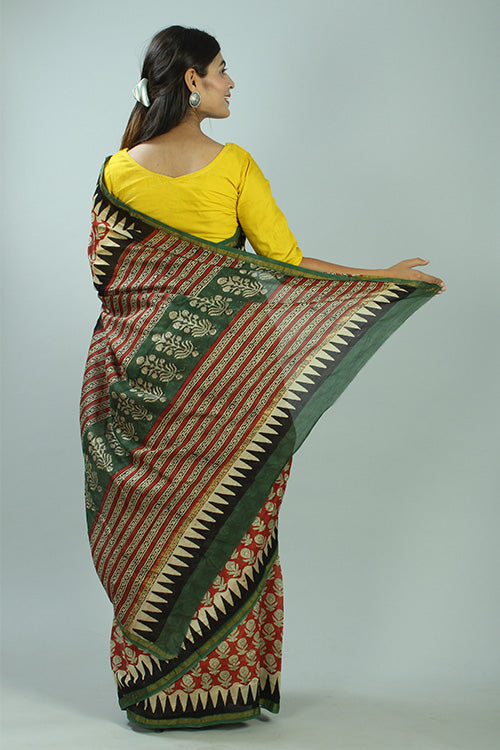 Natural, original and timeless traditional Bagru prints, seeped in goodness of the eternal charcol black, amadderred and natural ivory are pure elegant romance of an Artisan and its wearer. It’s a Chanderi Silk 5.5 mtr saree drape with exclusive 80 cm blouse piece to go with.