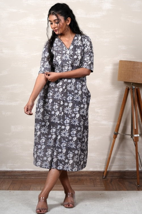 Our magnificent block printed dress blends heritage and modern elegance for your professional outfit. This dress, meticulously crafted, blends refinement with ethnic charm, making it ideal for the contemporary office.The shape of our Office Wear Artisan Block Printed Dress is great, balancing professionalism and style. A perfect workplace outfit, its precise fit and modest neckline draw attention without being extravagant. Elegantly draped, the dress flatters the female shape and allows for daytime mobility.The classic elegance of our professional Wear Artisan Block Printed Dress elevates your professional style. Elegant and well-made, it's a wardrobe must for the contemporary professional who values handmade workmanship.