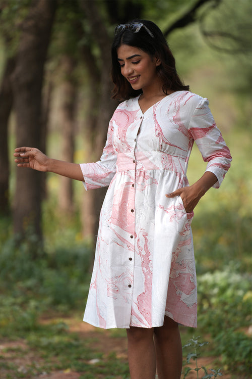 Experience the allure of our "Scarlet Streaks" Dress and let its mesmerizing pattern and bold colors make a statement. Embrace the artistic beauty of marble and express your unique sense of style with confidence and grace. Step into a world of elegance and turn heads wherever you go with this captivating dress. With Sootisyahi, you can embrace sustainable fashion without compromising on style. The use of azo-free dyes ensures a safer and more eco-friendly production process, allowing you to wear this dress with confidence and pride. Each dress is meticulously handcrafted by skilled artisans, ensuring attention to detail and a unique touch. The hand block printing technique adds an element of artistry and authenticity to the dress, showcasing the beauty of traditional craftsmanship. The flowing silhouette enhances the feminine charm, while the intricate floral patterns add a touch of grace and allure.