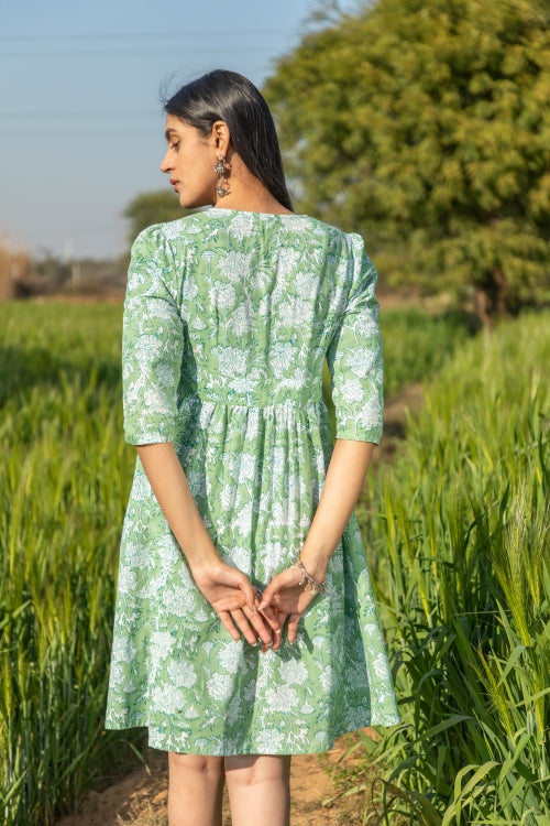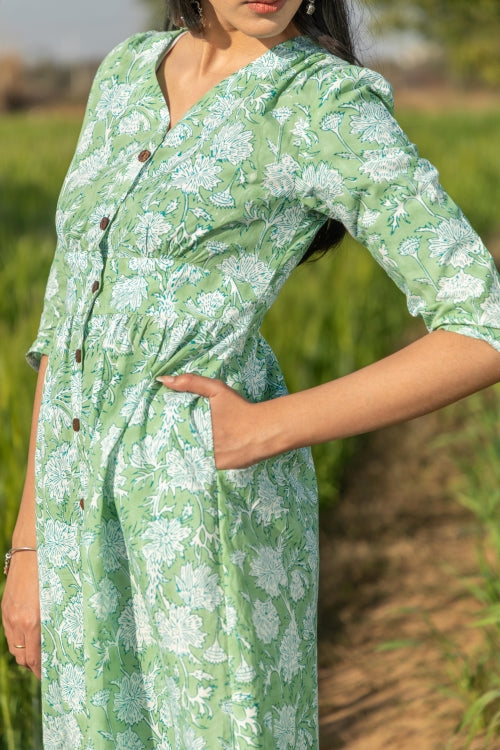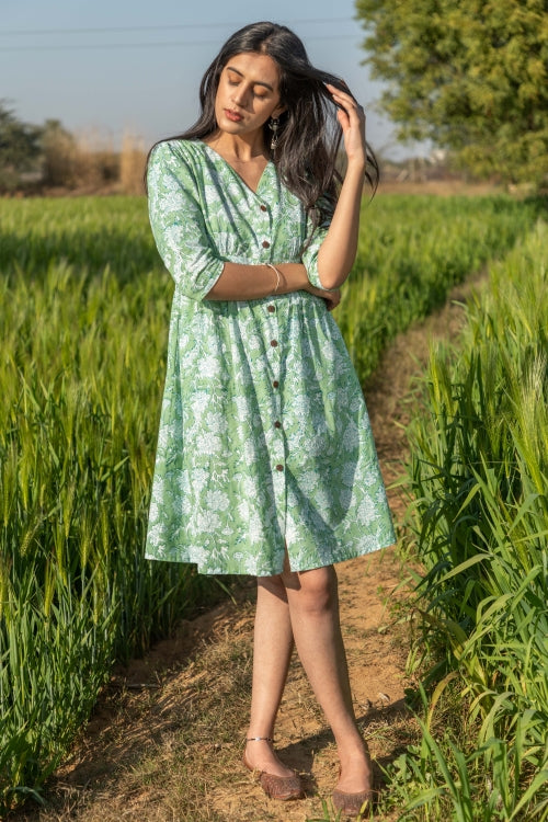 This floral beauty is what you’ve been missing. Sootisyahi’s ‘Sea Sage’ dress is crafted with the utmost care in pure cotton fabric, ensuring the best comfort. A smart color-blocking for a smart look, enjoy this combination in floral prints. Pick this breathable dress for a full day of comfort while working or relaxing.This piece comes with one pocket for your needs. Pair is with block heels or flats, a sling bag, and set out to have a wonderful day.This dress is stitched from azo free handblock printed fabrics which ensure an econfidence and commitment towards the ecological quality of our products.